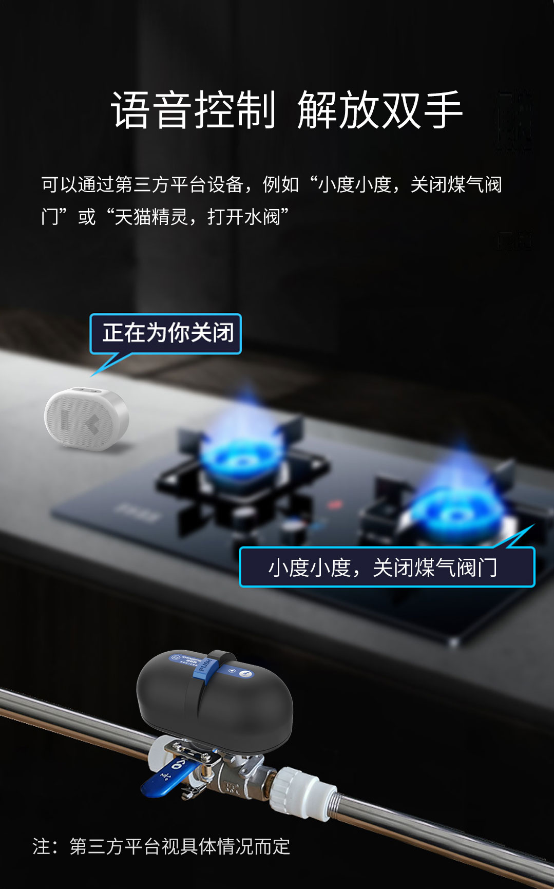 用戶可以通過(guò)第三方平臺(tái)設(shè)備,例如“小度小度,關(guān)閉煤氣閥門”或“天貓精靈,打開水閥”,開口就能開關(guān)閥門,讓您生活更便捷。