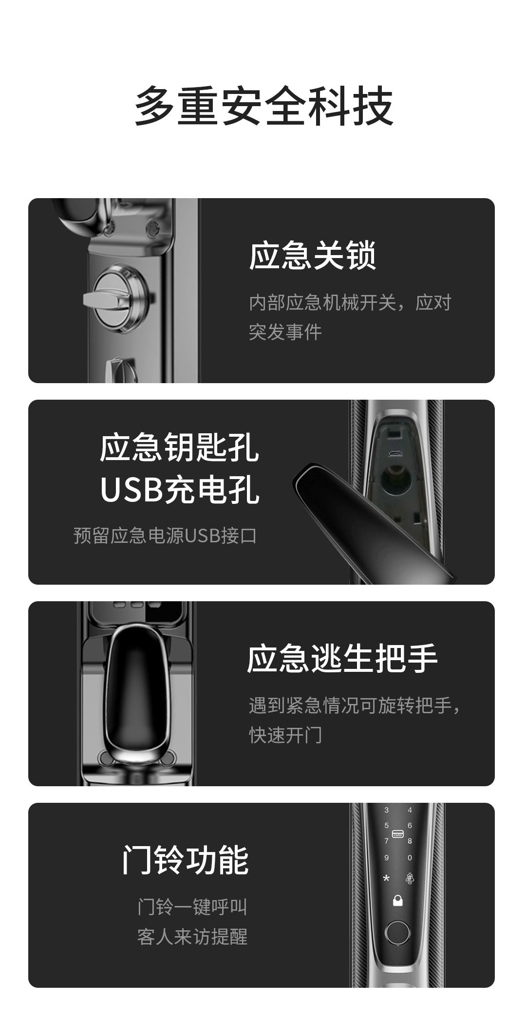 考慮到突發(fā)事件的發(fā)生,智匯云智能門鎖還配置了內(nèi)部應(yīng)急機(jī)械開關(guān)、應(yīng)急逃生把手,應(yīng)急鑰匙孔和USB充電孔,以便全方位守護(hù)居家安全。