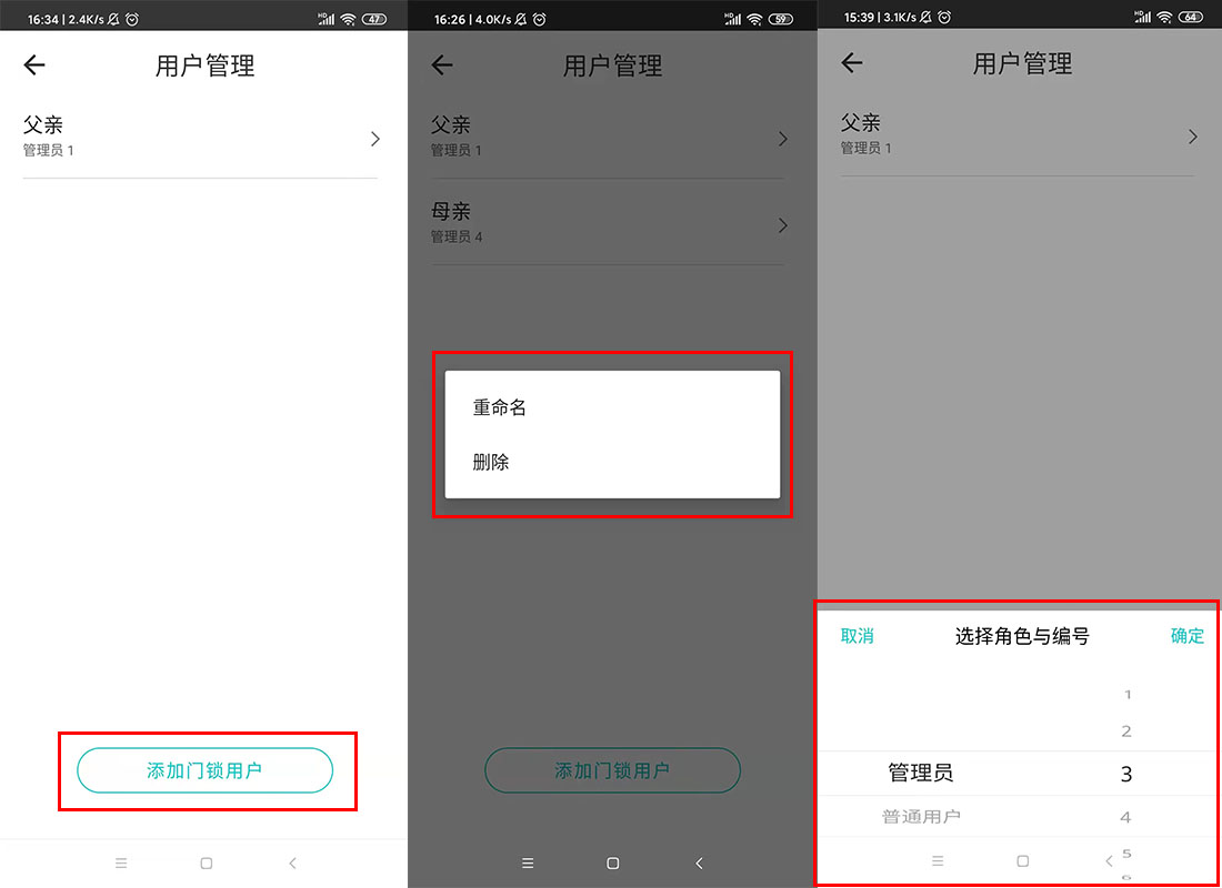 通過手機(jī)APP,我們還可以管理門鎖用戶,包括添加、刪除和重命名用戶,以及設(shè)置用戶管理權(quán)限。比如添加用戶“父親”后,當(dāng)“父親”開啟門鎖,將立刻推送開鎖信息至手機(jī)。