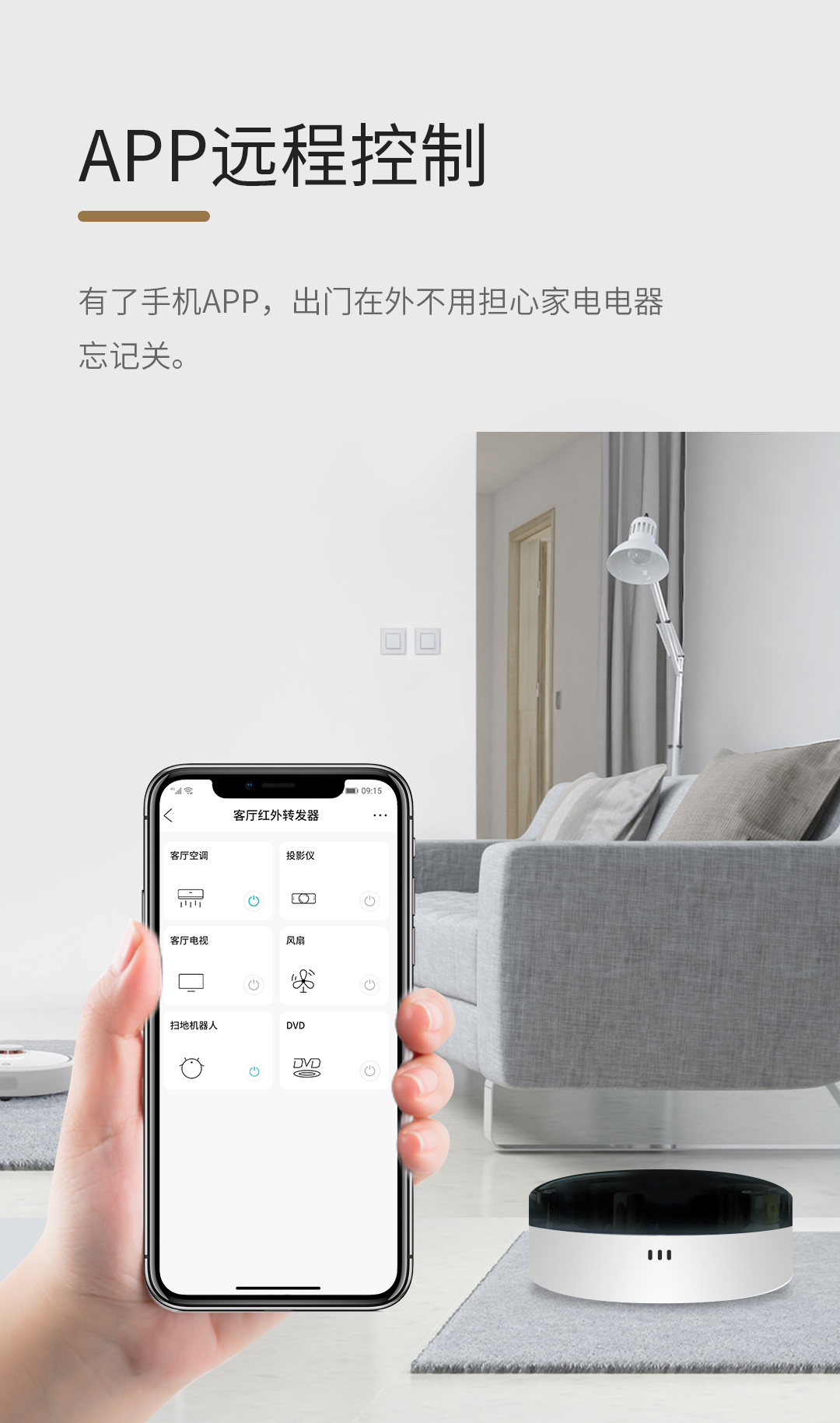 不需任何設(shè)備,只需要一個(gè)紅外轉(zhuǎn)化器即可實(shí)現(xiàn)家電控制,外出路上,能提前用手機(jī)APP打開家中空調(diào),也可以支持語音,遙控控制。