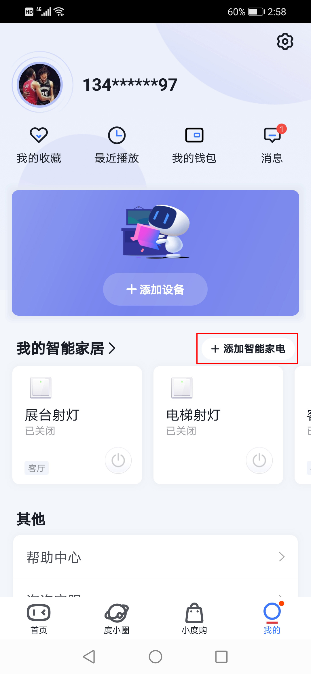 1、 打開“小度”APP,點(diǎn)擊下方“我的”欄,點(diǎn)擊“添加智能家電”;