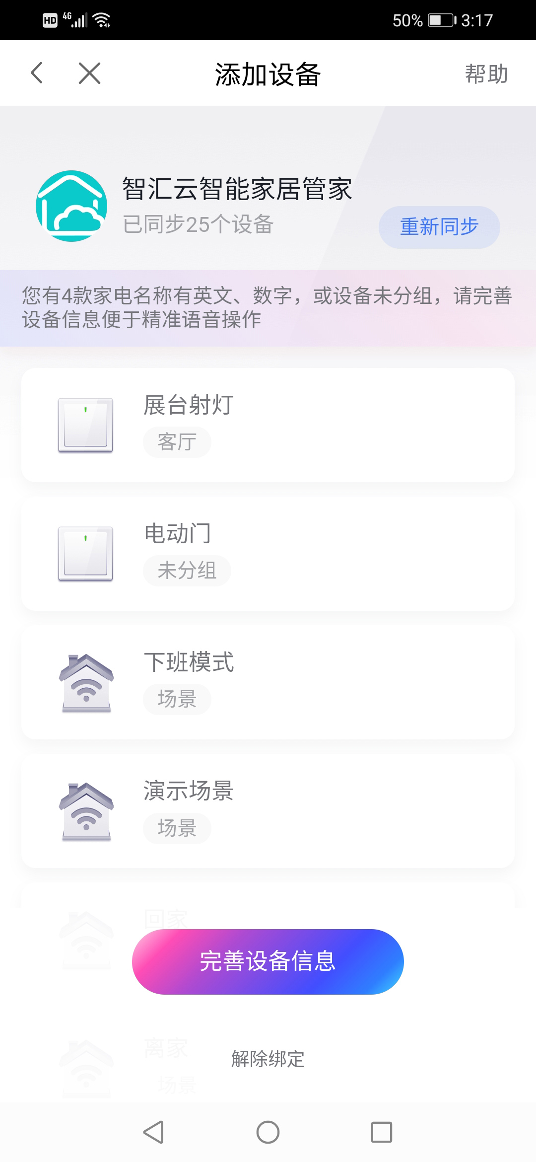 4、點(diǎn)擊同步設(shè)備,將智匯云的設(shè)備同步到“小度”APP;