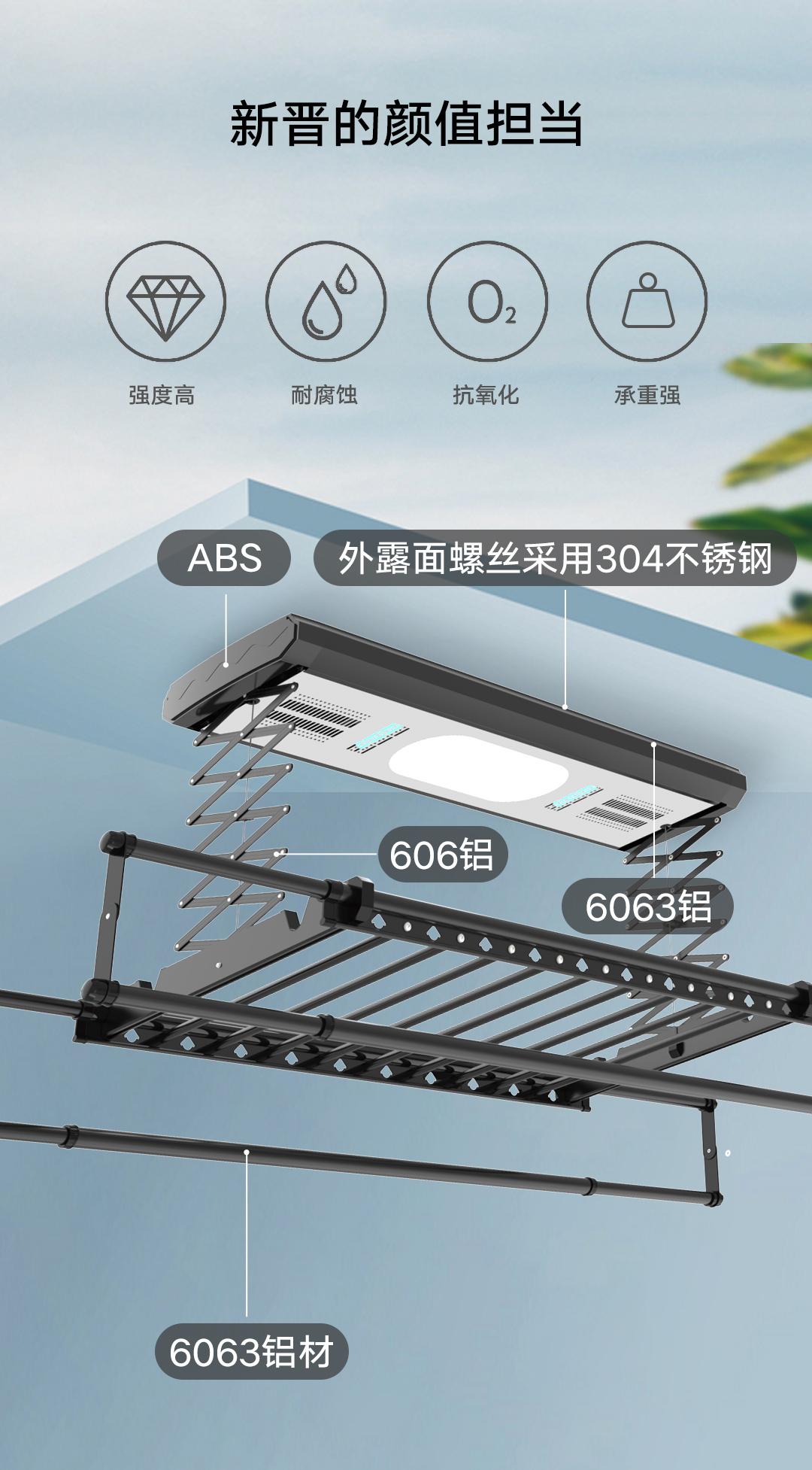 智匯云智能晾衣架采用了厚實鋁合金材質(zhì),表面抗UV多層處理,風吹日曬不易變色,可承重38kg,大件床品也可以輕松曬。