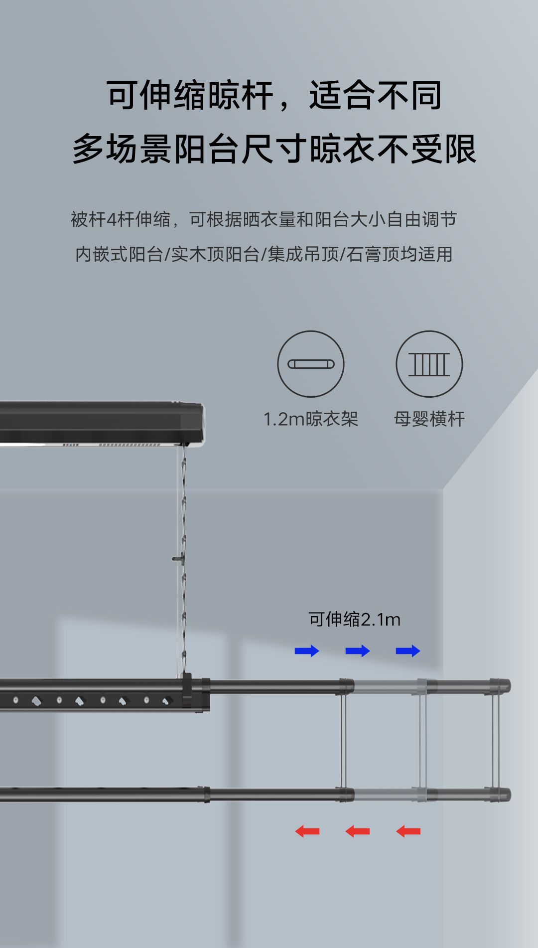 精致小巧的機身,在設(shè)計上,用極簡線條勾勒了完美機身。配備了1.2m到2.1m伸縮晾衣桿、母嬰橫桿,桿子上的多掛鉤設(shè)計更是最大限度的利用了機身空間,被桿4桿伸縮,讓小陽臺也可以承載更多的實用功能。