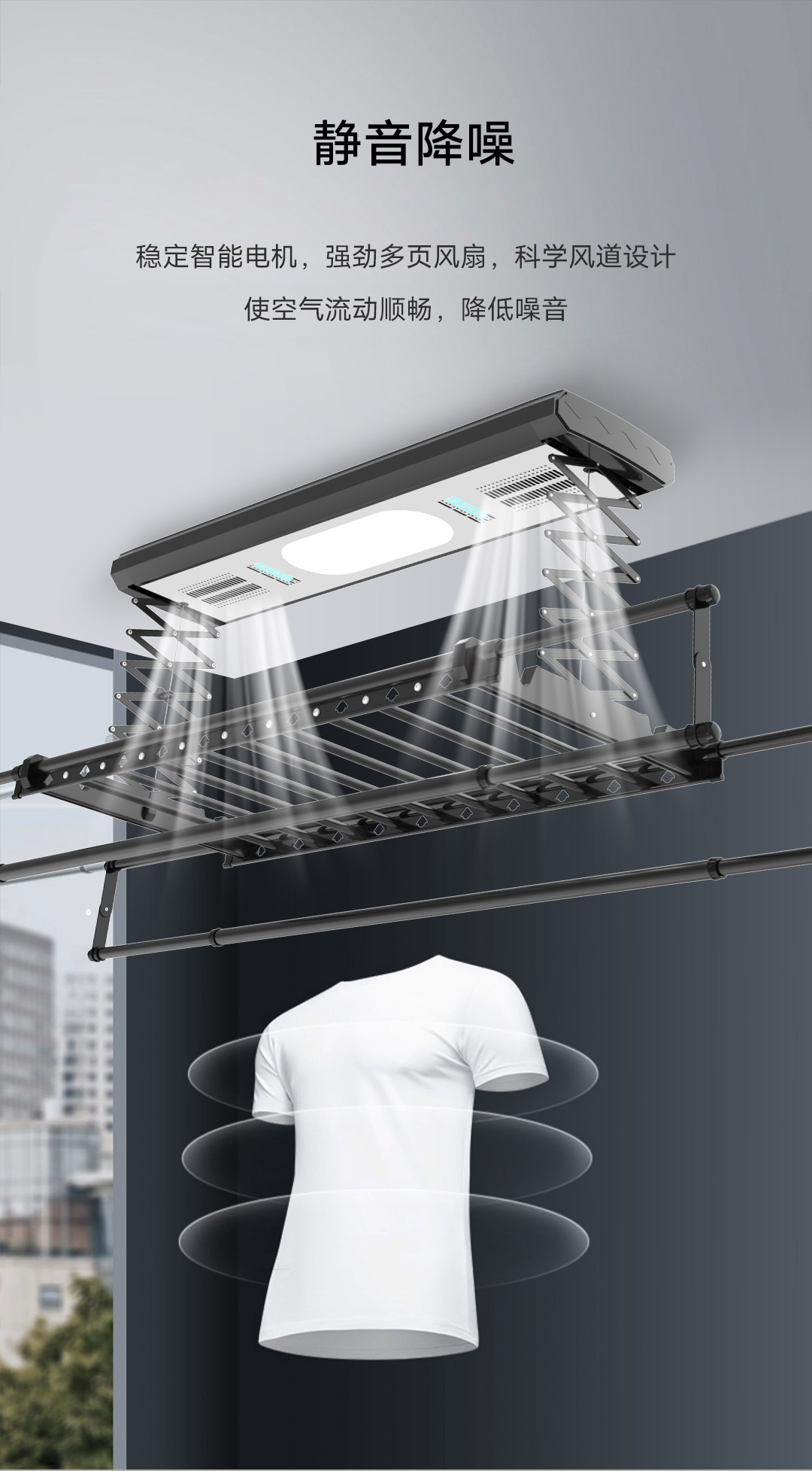 采用了降噪專利技術(shù),利用電源管理芯片將運行狀態(tài)的噪音降低到耳朵舒適的狀態(tài),即便是晚上晾曬衣服,也不會吵到家人。