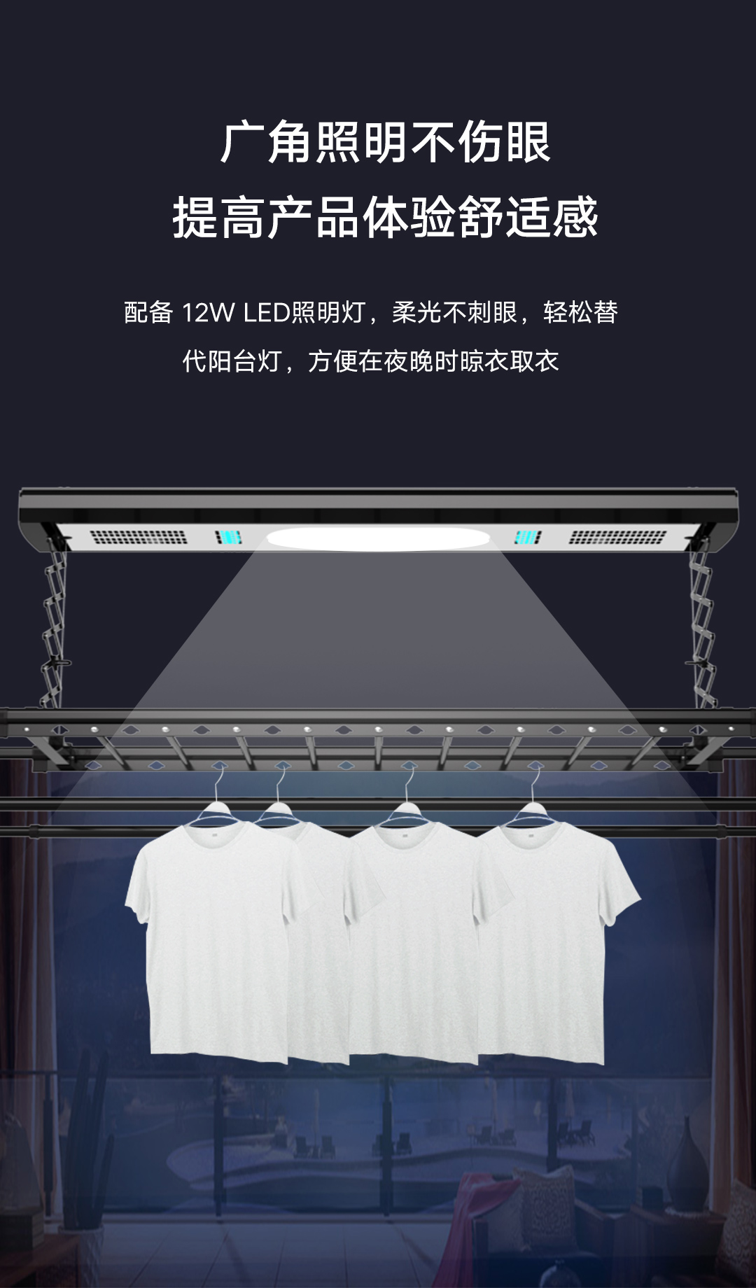 配備12W LED照明燈,柔光不刺眼,集晾衣、照明一體化,從此無死角廣角照明,不懼衣物遮擋,陽臺既明亮又不會造成光能浪費,也可以省電。