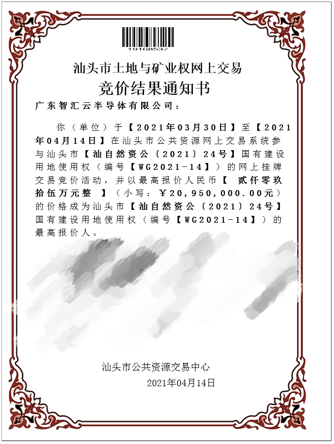 此外,廣東智匯云半導體有限公司也獲得相關政策支持。2021年4月14日,通過公開競拍獲得相關土地使用權。