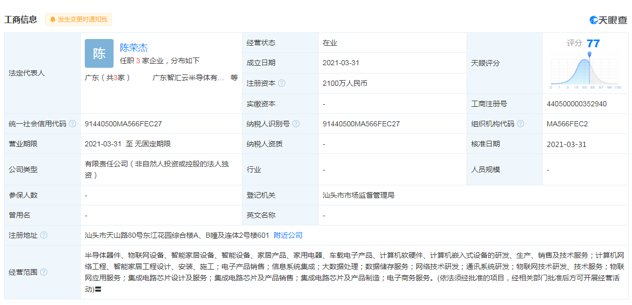 深圳市智匯云科技有限公司(下稱:智匯云)作為全屋智能家居系統(tǒng)領導品牌,始終保持對領先科技的敏感嗅覺,深耕AI、IOT等前沿領域。隨著業(yè)務的發(fā)展不斷壯大,為進一步推進公司智能家居的戰(zhàn)略布局,促進智能家居業(yè)務的開拓,日前已經在廣東成立全新的子公司,主攻半導體的設計開發(fā)工作。全新的子公司名為廣東智匯云半導體有限公司,由深圳市智匯云科技有限公司100%持股,注冊地在廣東省汕頭市。