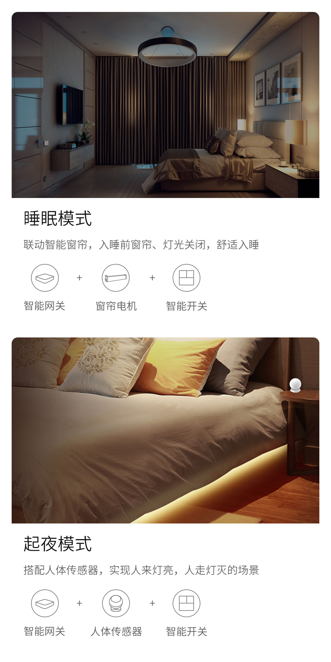 K1C系列智能開關搭配網(wǎng)關使用,可實現(xiàn)不同設備間的場景聯(lián)動。比如搭配紅外人體傳感器,實現(xiàn)“人來燈亮,人走燈滅”的場景;聯(lián)動智能窗簾,睡前輕輕一按場景面板,燈光熄滅,窗簾緩緩拉上,輕松進入睡眠狀態(tài)。