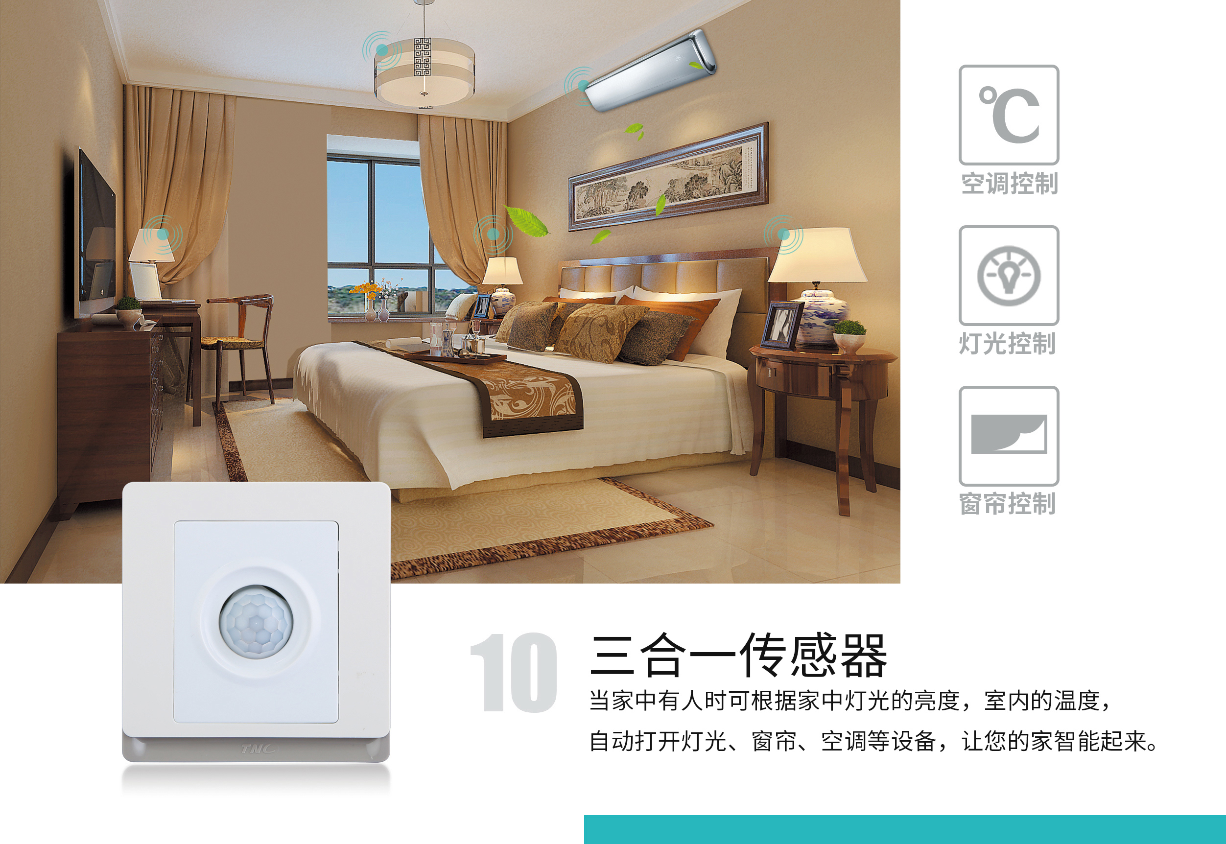 智能開關(guān)面板還可以搭配傳感器來實現(xiàn)控制,在通道或是床邊安裝傳感器,人經(jīng)過就可以通過傳感器的判斷,自動打開通道及主要區(qū)域的燈光;常見的可作為夜起時的燈光控制,半夜口渴或是想上廁所時,起床經(jīng)過床邊的傳感器,就可以開啟客廳、廁所及主要過道的燈光,無需摸黑去尋找開關(guān)面板。
