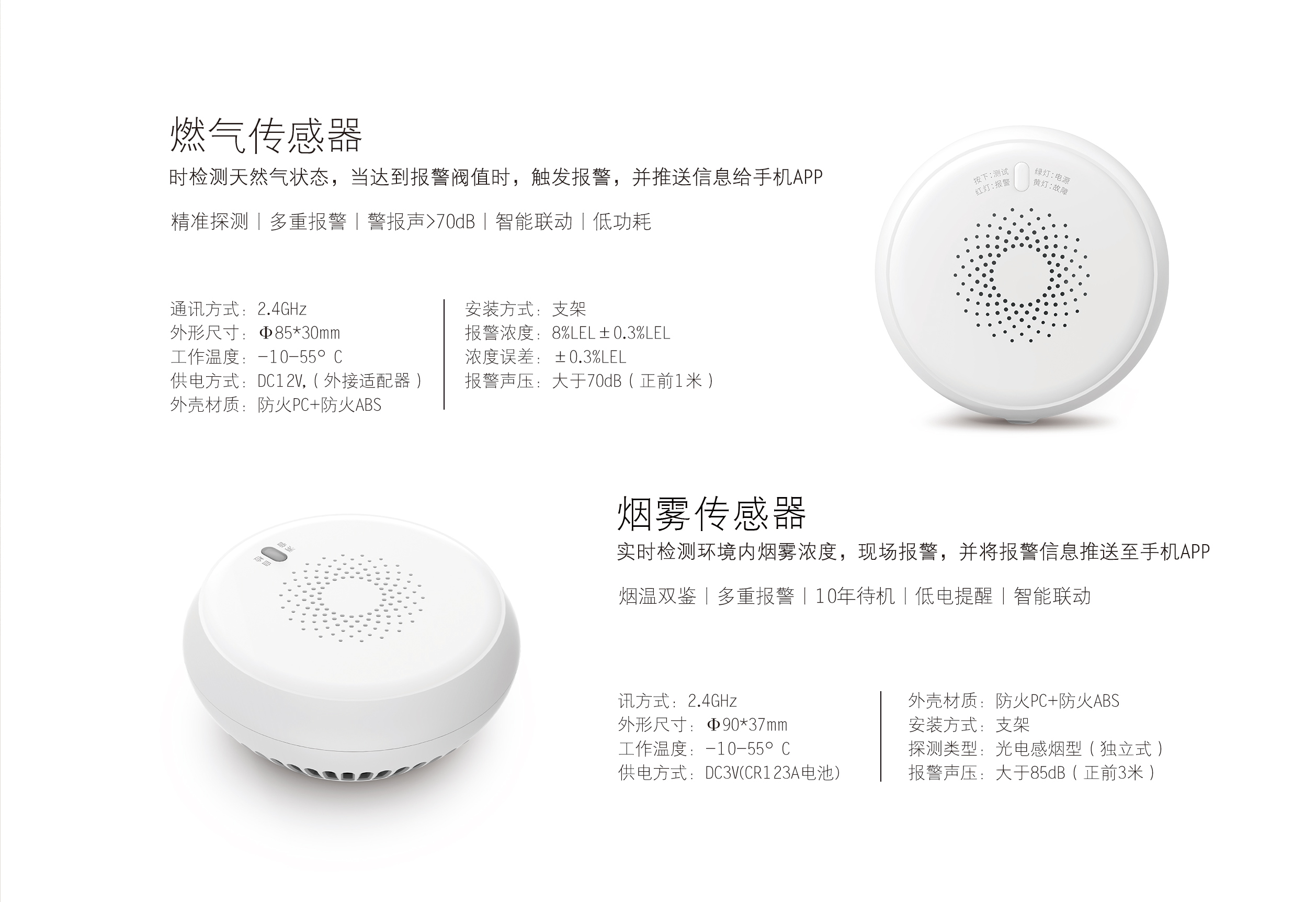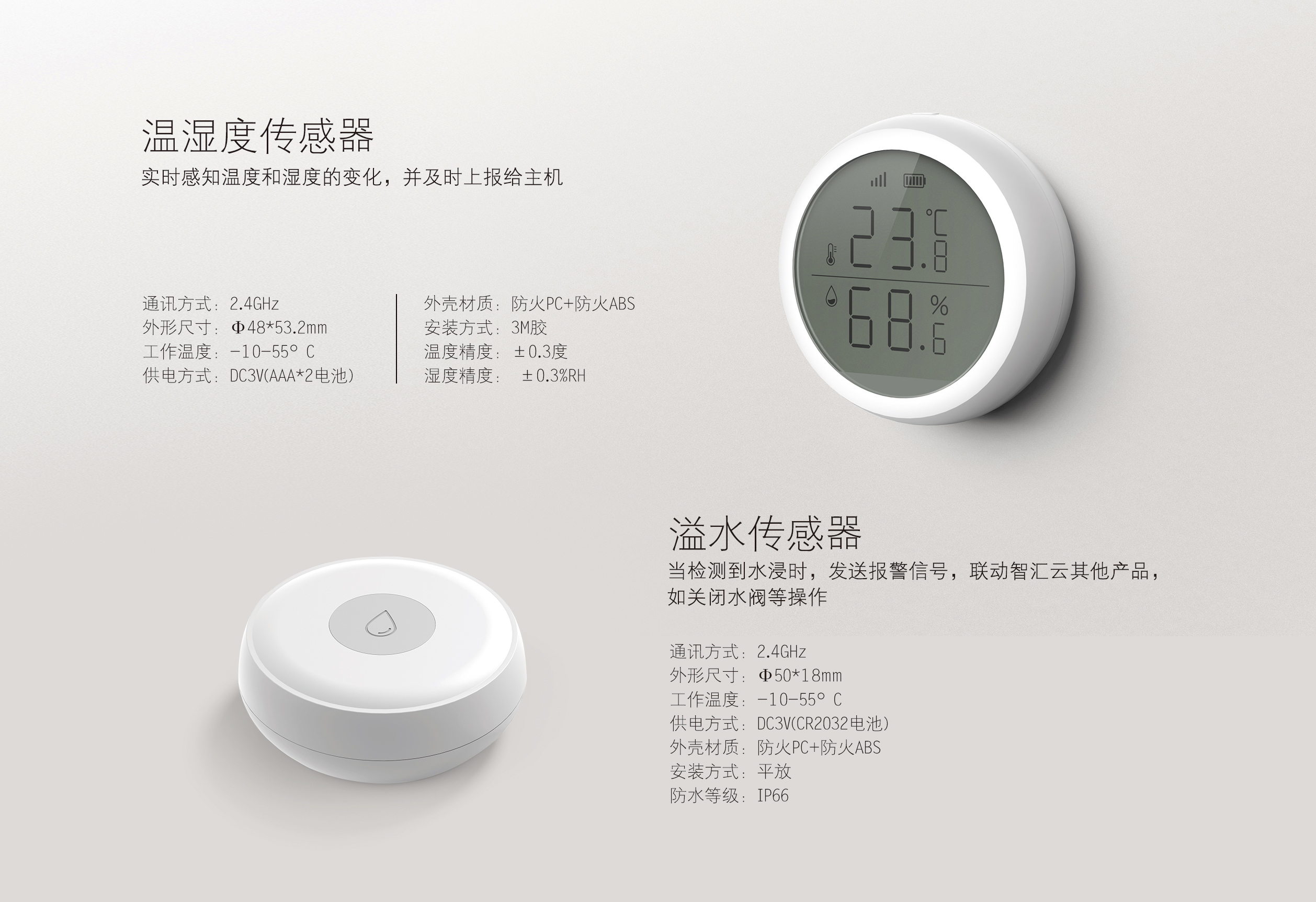 智匯云智能家居將于本次展會展示智能傳感器系列新品,包括門窗傳感器、溫濕度傳感器、溢水傳感器、燃氣傳感器、煙霧傳感器、人體紅外傳感器,還有緊急按鈕。這幾款傳感器均可以在實時接收感應后實現(xiàn)相應智能場景聯(lián)動控制,或是觸發(fā)報警主動上報給主機,并推送信息至用戶手機APP,避免出現(xiàn)財產(chǎn)損失。