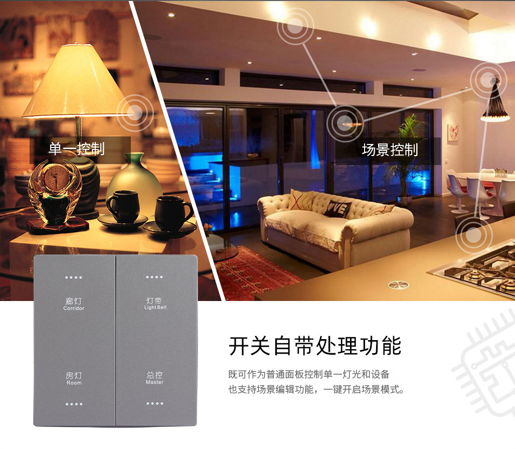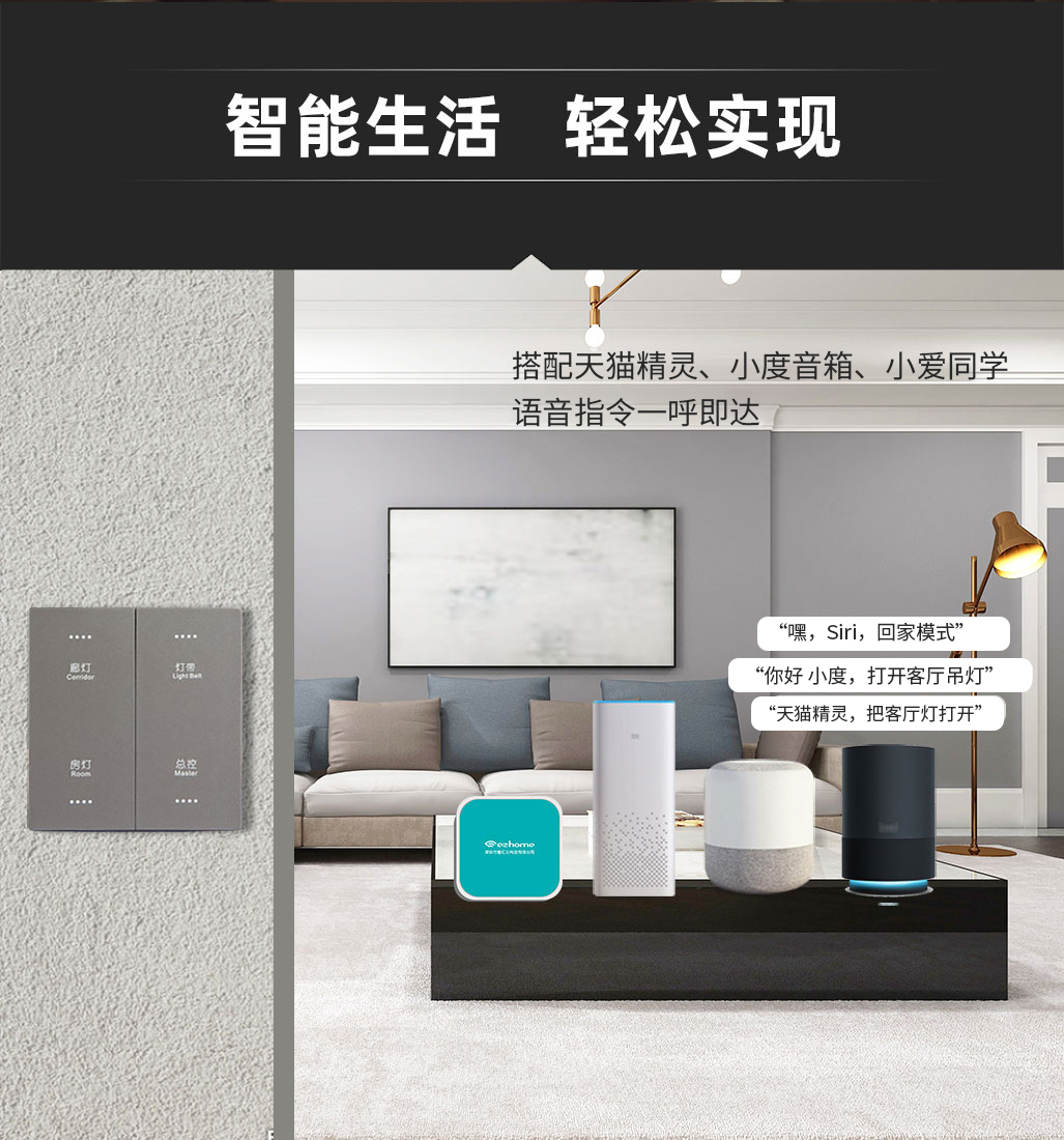 語音控制:可搭配三大主流品牌智能語控設(shè)備,輕松實現(xiàn)語音控制;也支持蘋果系統(tǒng)“Siri”語音指令實現(xiàn)場景模式控制。