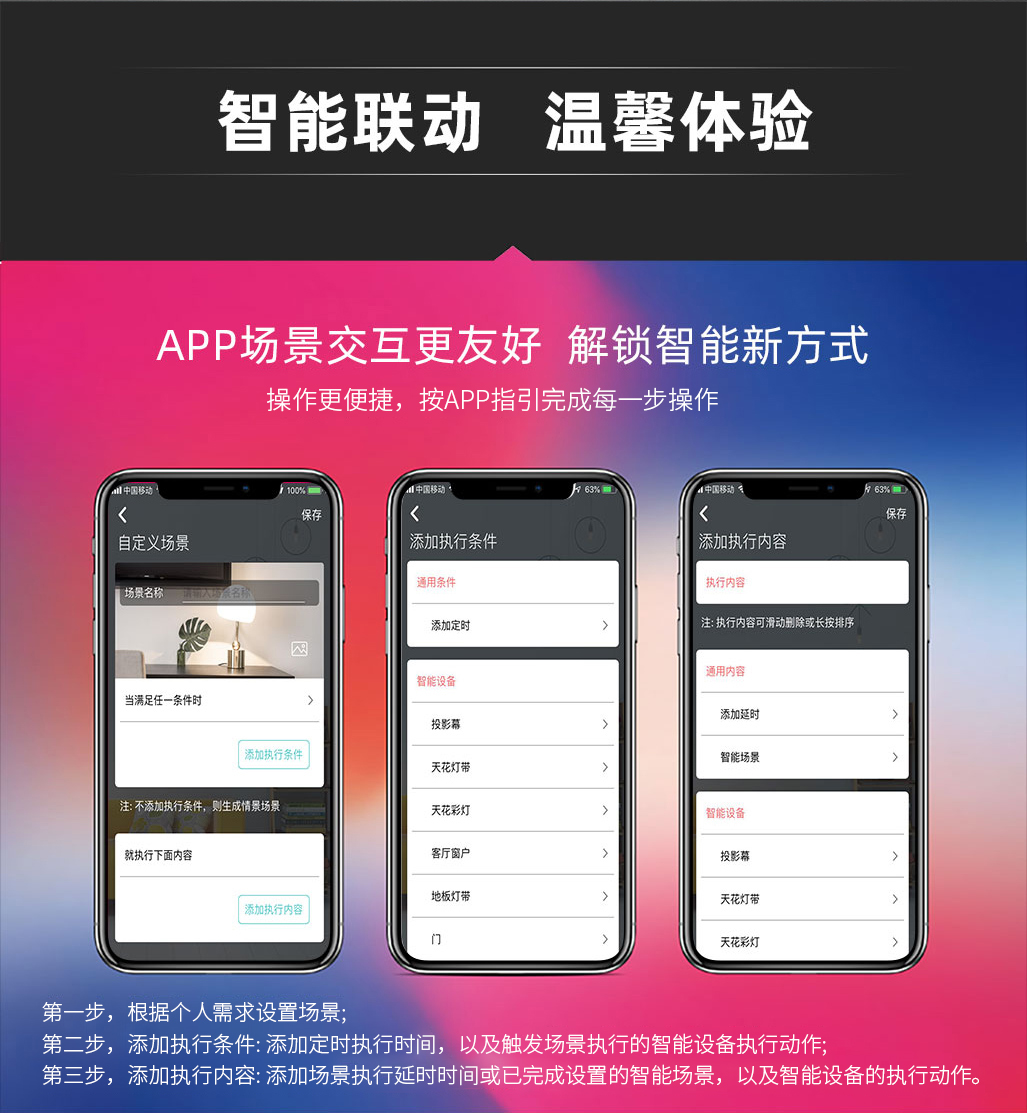 僅需按照APP指引,逐步完成場景模式編輯,三步達成智能場景聯(lián)動。