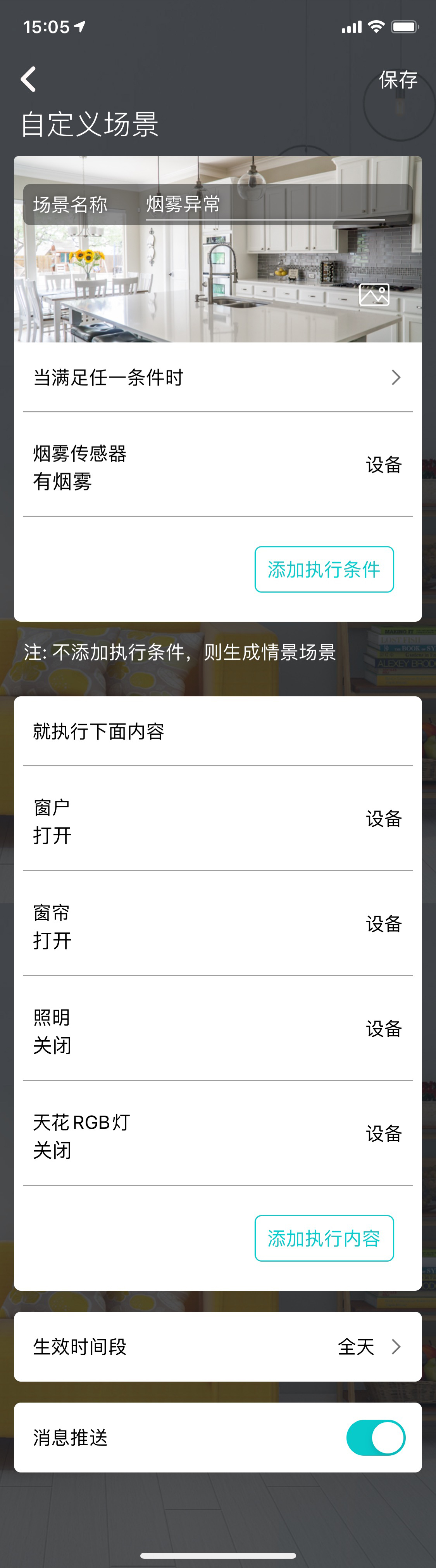 煙霧傳感器可以在感應(yīng)異常煙霧出現(xiàn)時(shí),聯(lián)動(dòng)讓關(guān)聯(lián)區(qū)域內(nèi)的電器斷電;用戶(hù)在收到報(bào)警推送后可以及時(shí)求助,處理緊急情況。