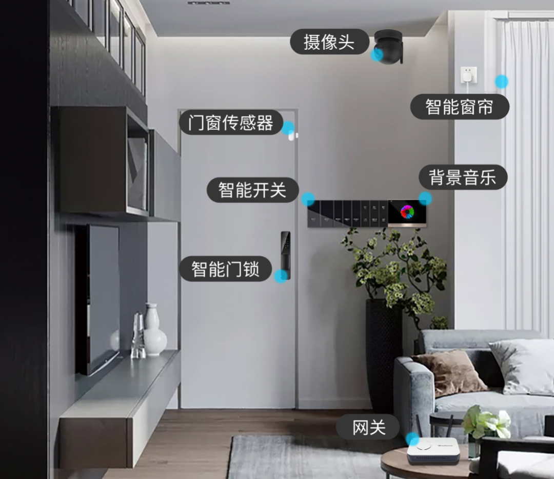 需要設(shè)備:智能門鎖、門窗傳感器、網(wǎng)關(guān)、家用云臺攝像機、智能窗簾、背景音樂、輕觸開關(guān)Z1三位面板