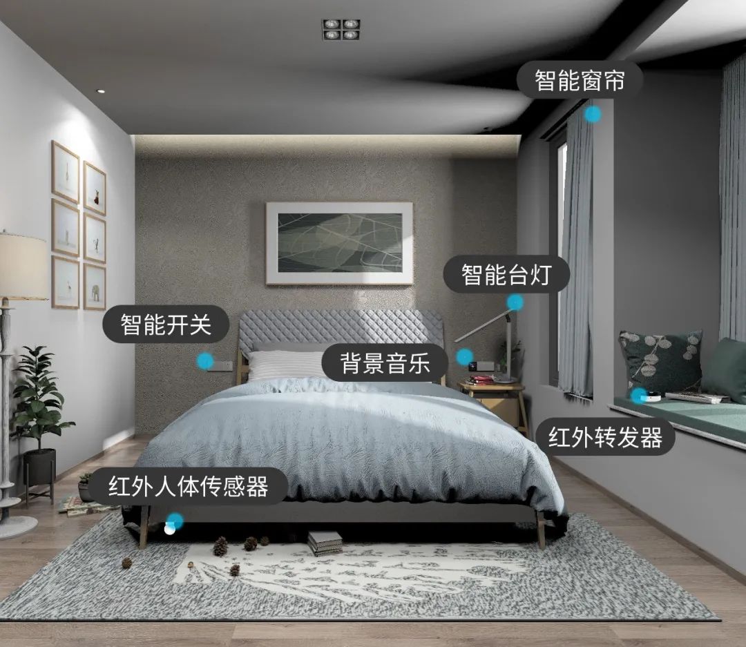 需要設(shè)備:智能臺燈、智能窗簾、背景音樂、紅外轉(zhuǎn)發(fā)器、紅外人體傳感器