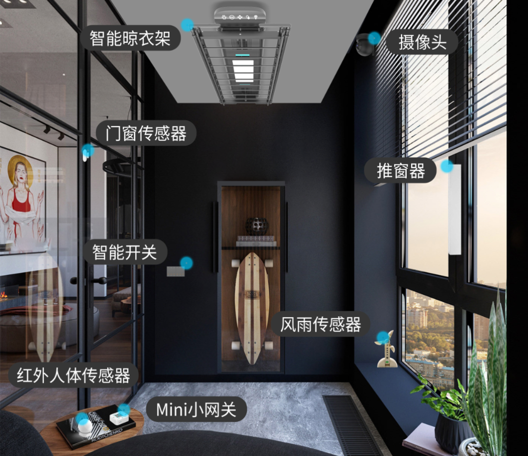 需要設(shè)備:風(fēng)雨傳感器、推窗器、門窗傳感器、家用云臺攝像機、紅外人體傳感器、網(wǎng)關(guān)、智能晾衣架、輕觸開關(guān)Z1三位面板