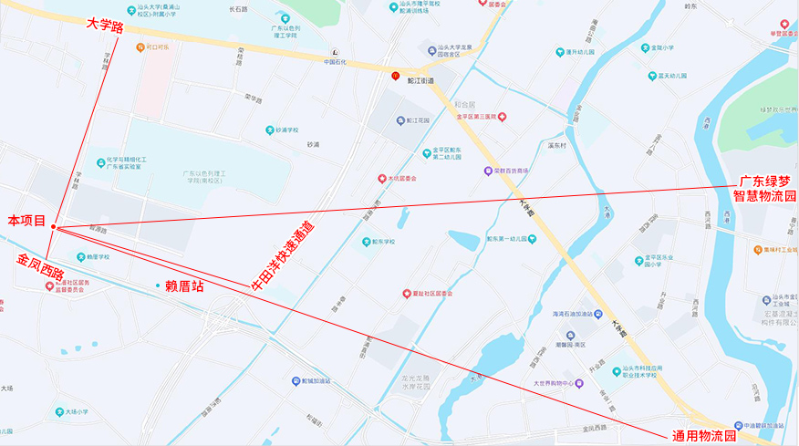 地理位置優(yōu)越,距離粵東城際鐵路-賴厝站1公里,距離潮汕環(huán)線高速鮀蓮站5公里,距離在建牛田洋快速1.5公里,南距離金鳳西路300米,北距大學路1.2公里,無縫連接城市交通動脈; 30分鐘通達市中心、機場及物流效率領先。距離汕頭綠夢智慧物流園區(qū)4.1公里,距離通用物流園4公里,物流方便快捷促進園區(qū)項目資源要素快速流動。