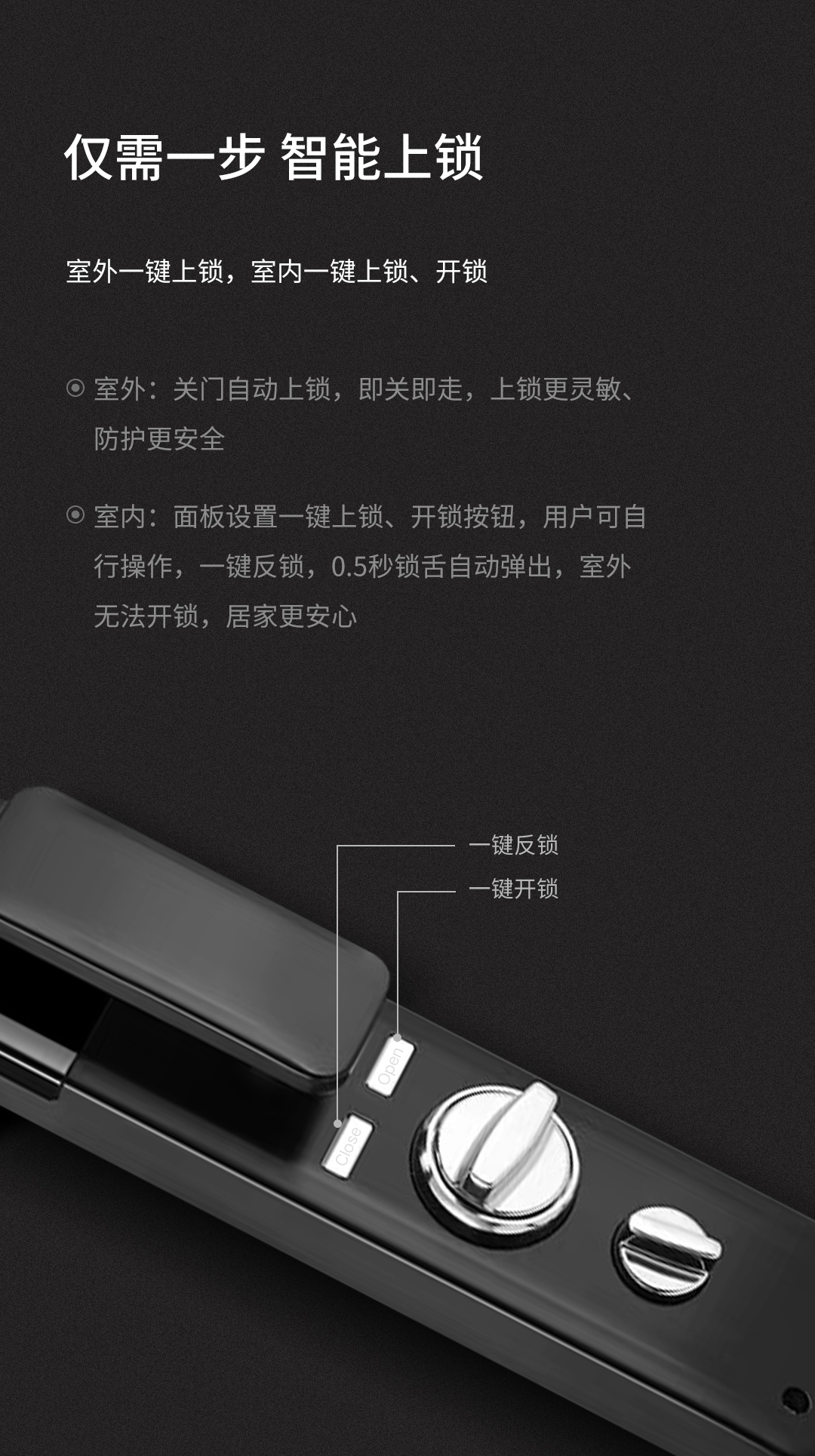 按鍵下方還設(shè)有“反鎖旋鈕”,室內(nèi)獨立反鎖,對于獨居在家的女性或者家里有小孩老人的家庭,不僅可以保障安全,也可以保護隱私。