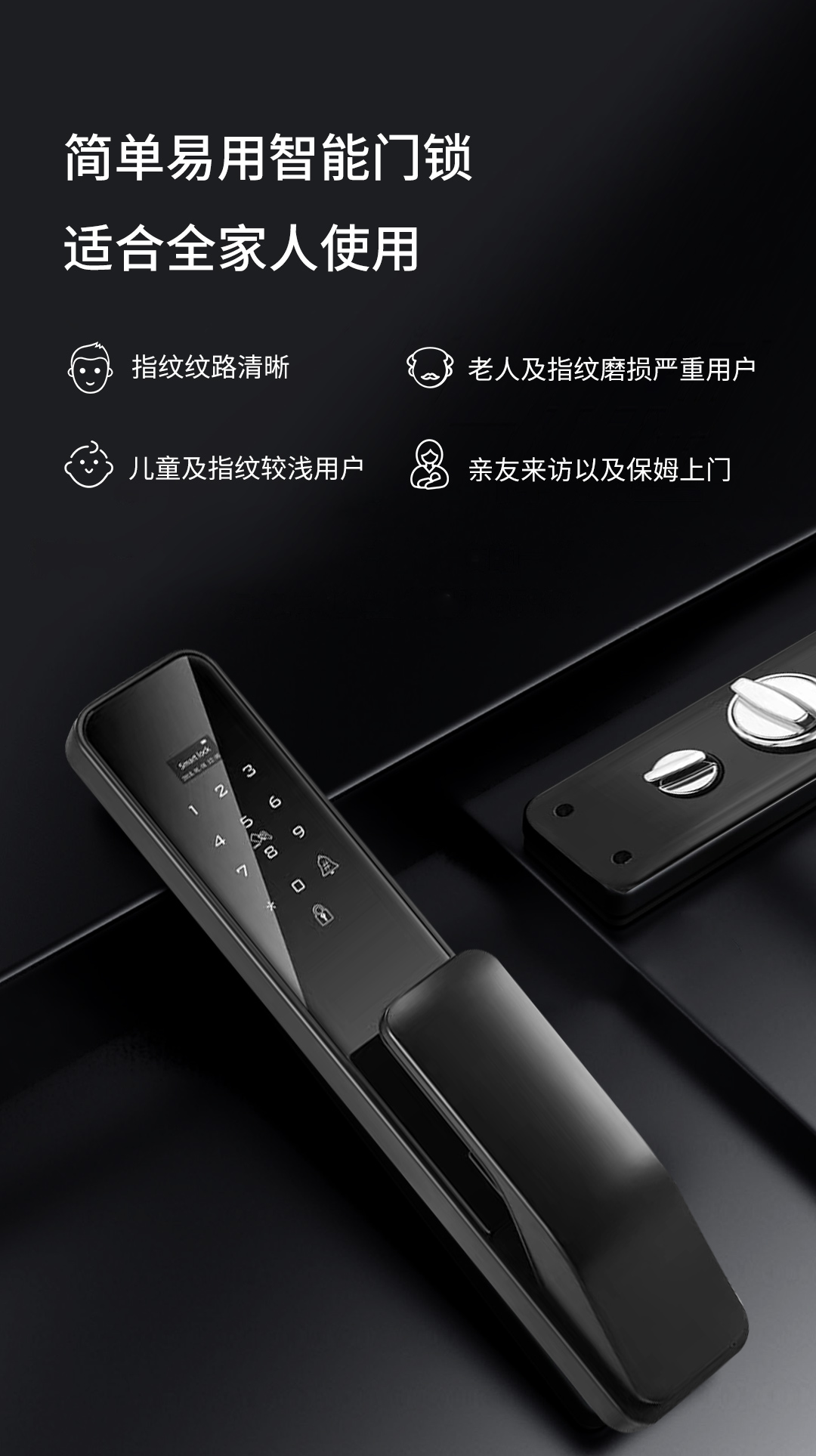 無論是指紋磨損嚴(yán)重的老人還是指紋比較淺的小孩都可以精準(zhǔn)識別,可以容納多達(dá)100枚的指紋記憶,家里人多也不怕。