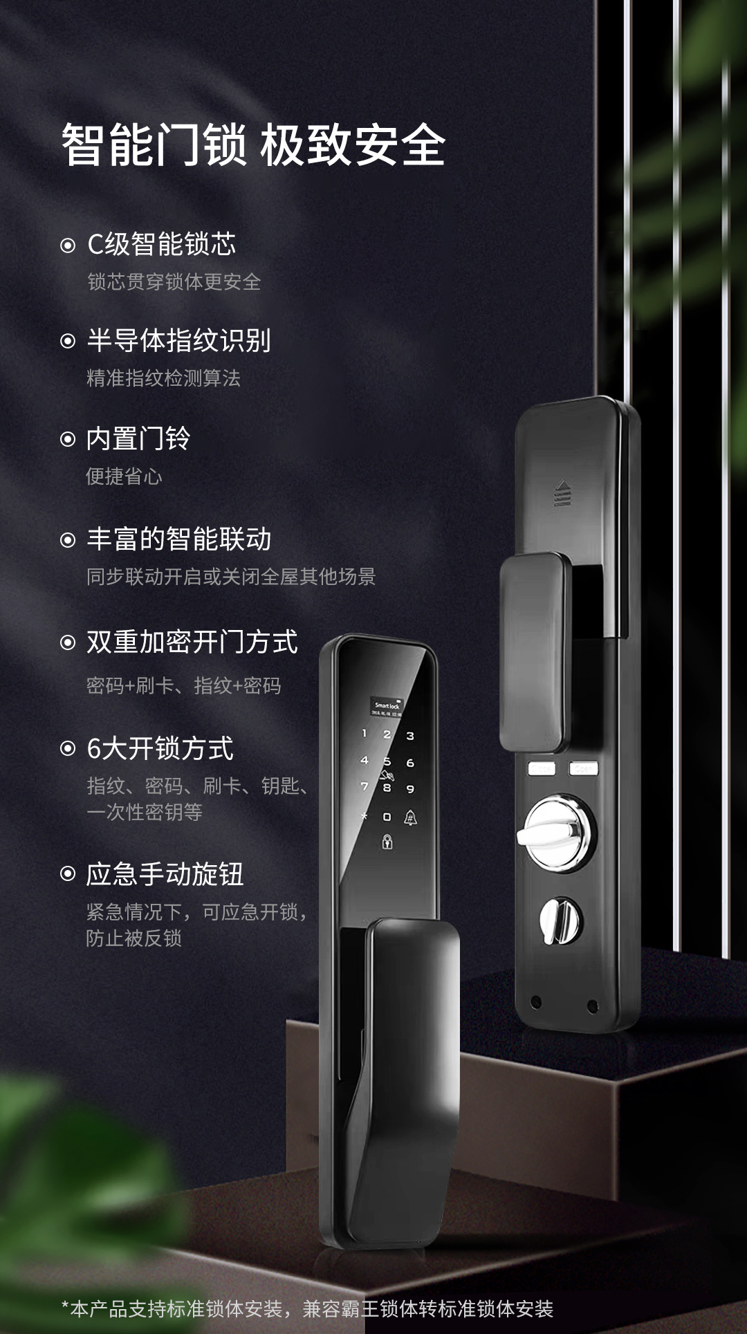 支持“密碼+刷卡”、“指紋+密碼”等雙重加密解鎖方式,多重安全防護,給家門牢固的安全守護。