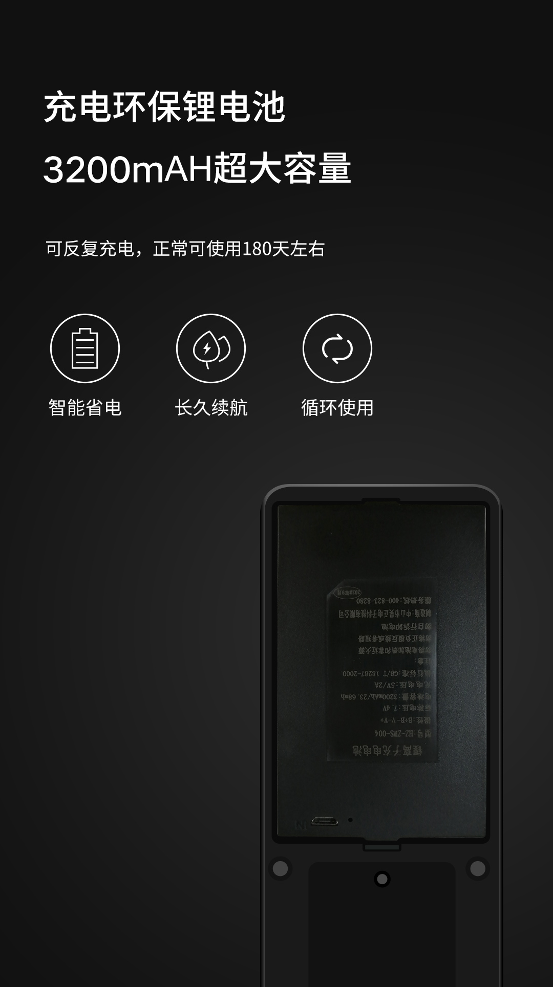 智能鎖A16由可充電環(huán)保鋰電池供電,3200mAH超大容量,充電一次用3個月,超長續(xù)航。