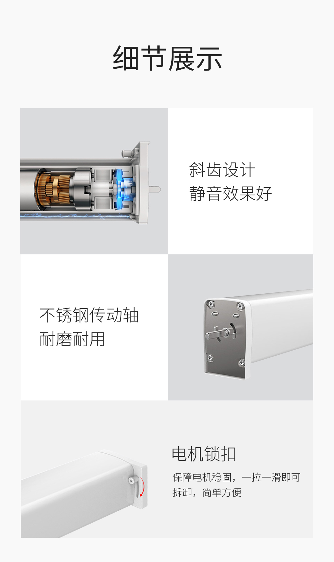 采用直流電機(jī)驅(qū)動和高扭矩馬達(dá),可承重50kg的窗簾平穩(wěn)運(yùn)行,品質(zhì)穩(wěn)定,運(yùn)行順滑無噪音。