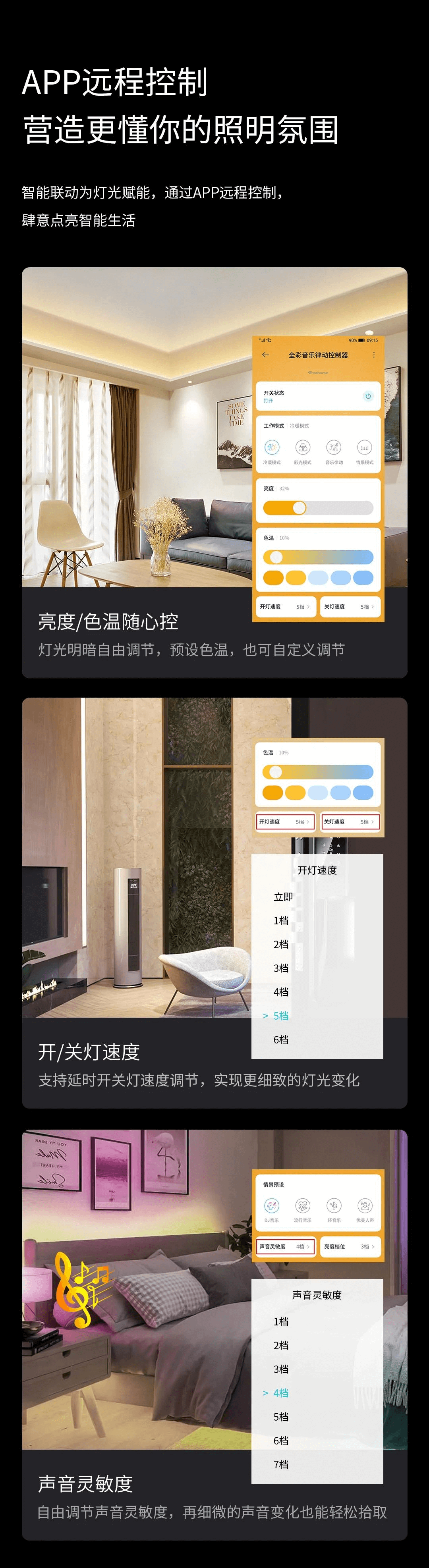 區(qū)別于市面上大部分通過手機(jī)話筒拾音的調(diào)光控制器,控制器內(nèi)置微型麥克風(fēng)拾音,精準(zhǔn)識(shí)別音樂的變化而發(fā)出指令,使燈帶隨著音樂的律動(dòng)變換色彩。