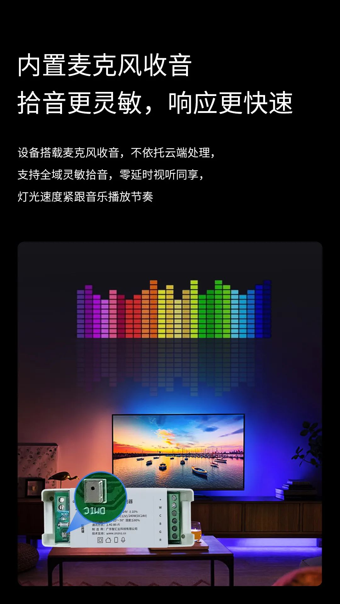 智匯云重磅推出全新產(chǎn)品全彩音樂律動(dòng)控制器,接入米家生態(tài),搭配燈帶使用,支持調(diào)節(jié)燈光顏色、色溫和亮度,燈光色彩隨音樂律動(dòng),輕松實(shí)現(xiàn)聲控發(fā)光,營造出適合不同生活情景的燈光氛圍。