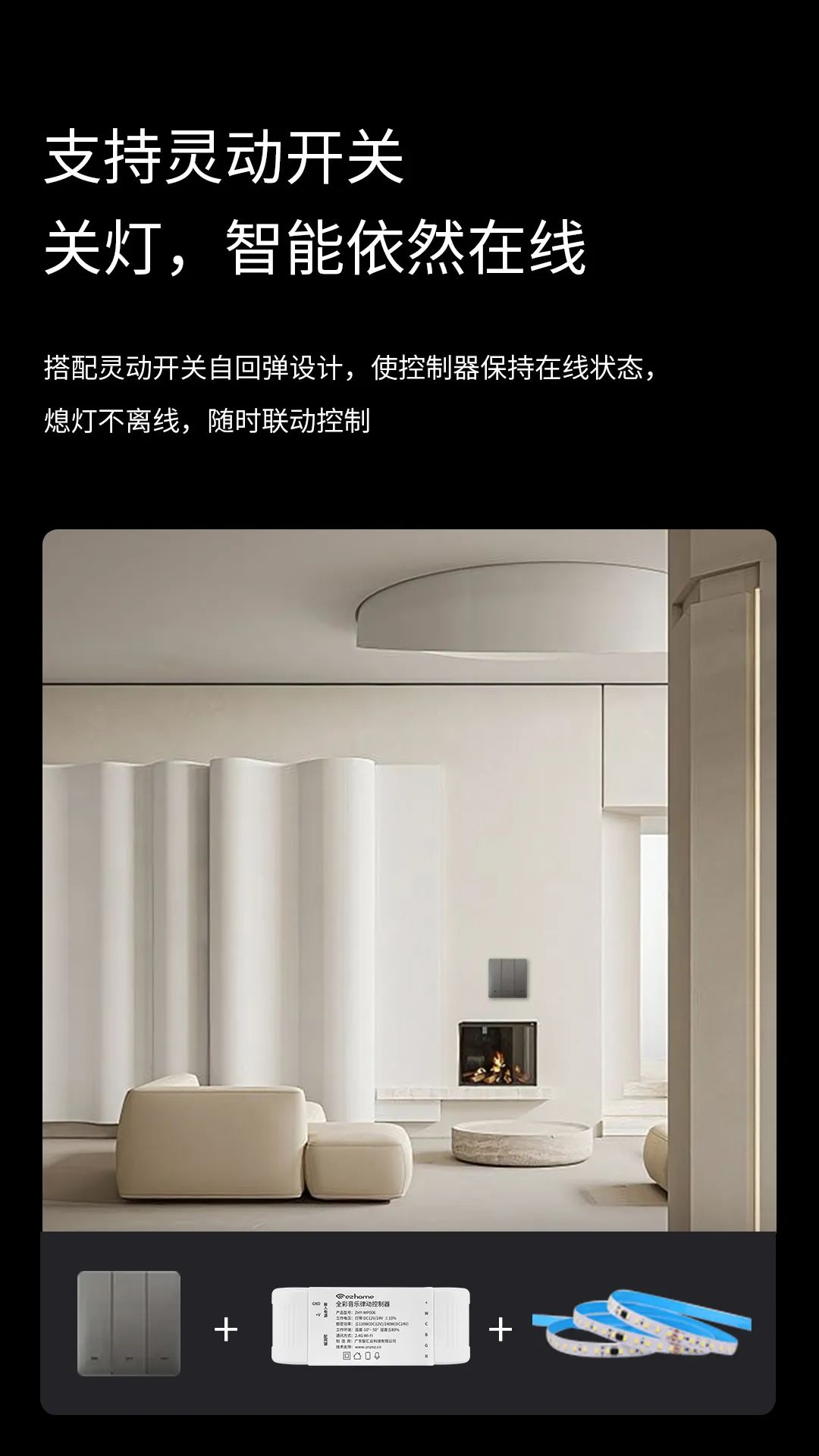 該控制器支持搭配靈動(dòng)開關(guān)使用,關(guān)燈不會(huì)令設(shè)備斷電離線,時(shí)刻保持聯(lián)網(wǎng)響應(yīng)。