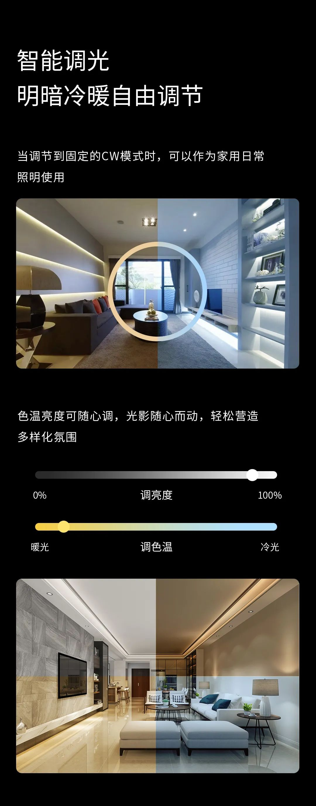 當(dāng)切換到冷暖模式時(shí),用戶可以對燈光的亮度和色溫進(jìn)行精確的自由調(diào)節(jié)。從落日余暉到盛夏晴空,根據(jù)自己的生活習(xí)慣打造個(gè)性化燈光場景。