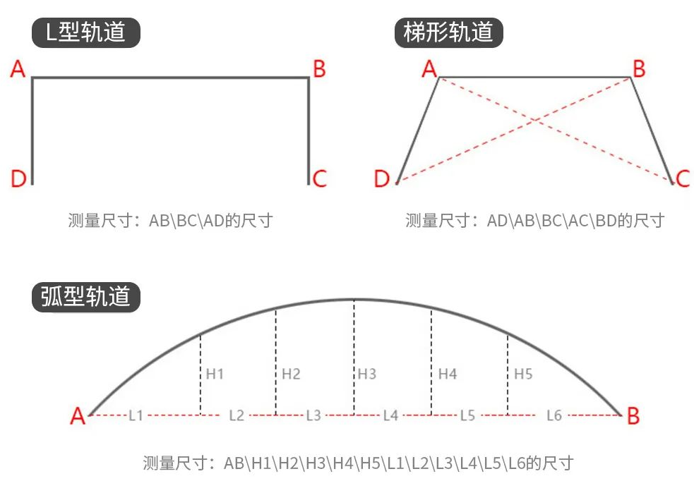 不規(guī)則的軌道在測(cè)量的時(shí)候就需要測(cè)量多幾個(gè)尺寸,比如單軌L型、梯形、弧形等。