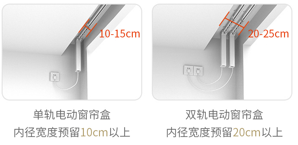 單軌的窗簾,窗簾盒的寬度要預(yù)留10-15cm;雙軌的窗簾,窗簾盒的寬度要預(yù)留20-25cm。