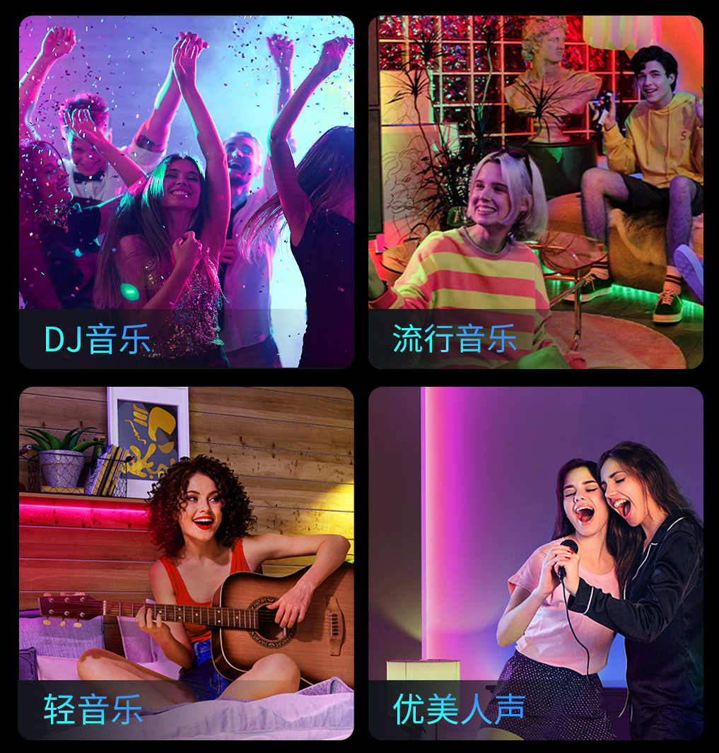 可以讓燈光跟隨音樂(lè)節(jié)奏律動(dòng)變化,不斷切換燈效,發(fā)生顏色以及亮度上的變化。聲光同步,不斷跳躍,好的音樂(lè)和歌曲也能夠很好的展現(xiàn)出來(lái),氛圍感直接拉滿。