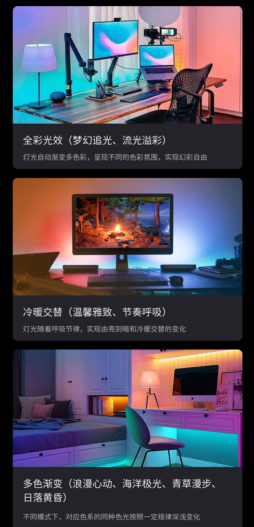 APP還預(yù)設(shè)有多種光效模式,適配各種不同的場(chǎng)景,一鍵切換不同的燈光風(fēng)格效果。