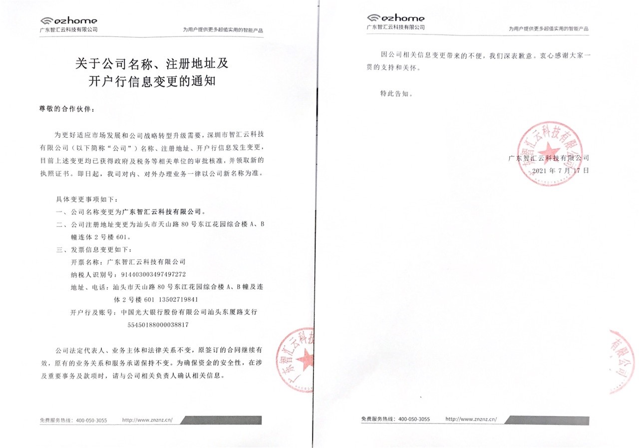 一、公司名稱變更為廣東智匯云科技有限公司。