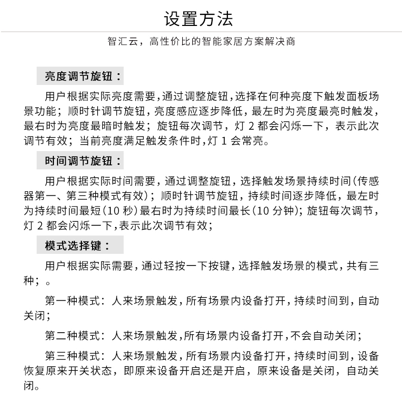 三合一傳感器內(nèi)置了溫度、亮度、移動檢測3個(gè)傳感器,可根據(jù)燈光的明暗、溫度的高低、是否有人來判斷是否執(zhí)行開關(guān)燈、開空調(diào)、開窗簾等