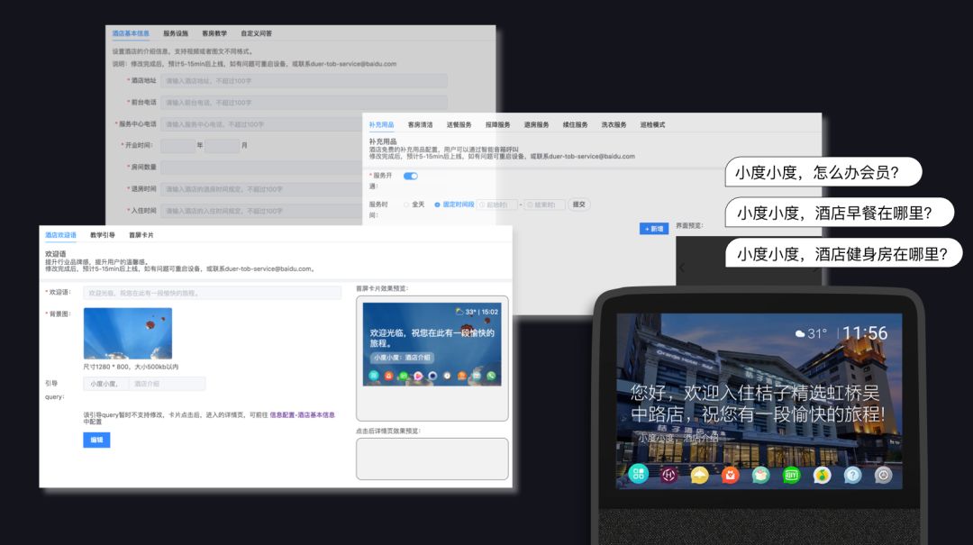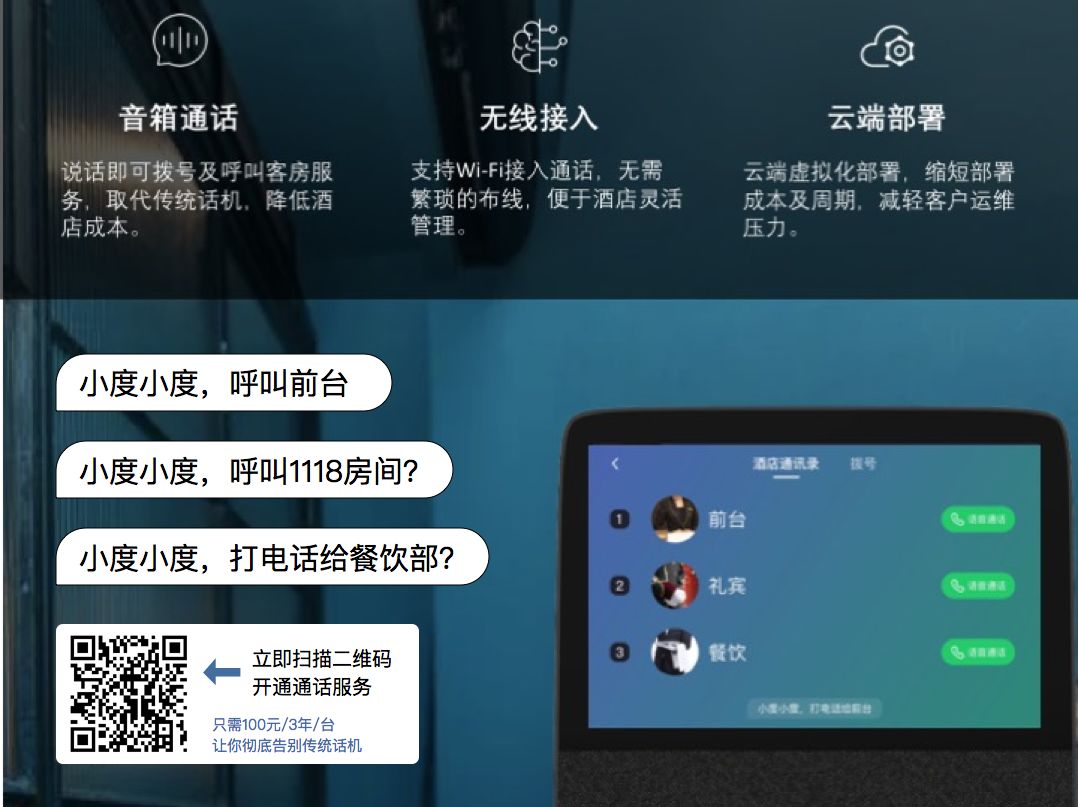 客人再也不需要因?yàn)橐恍┬栴}不停的撥打前臺(tái)電話,如:房間wifi是多少?電視好像打不開了?明天早上在哪里吃早餐啊?等等。這些基礎(chǔ)問題,酒店都可以提前設(shè)置,客人只需呼喚:“小度小度,打掃客房” ... 即可。