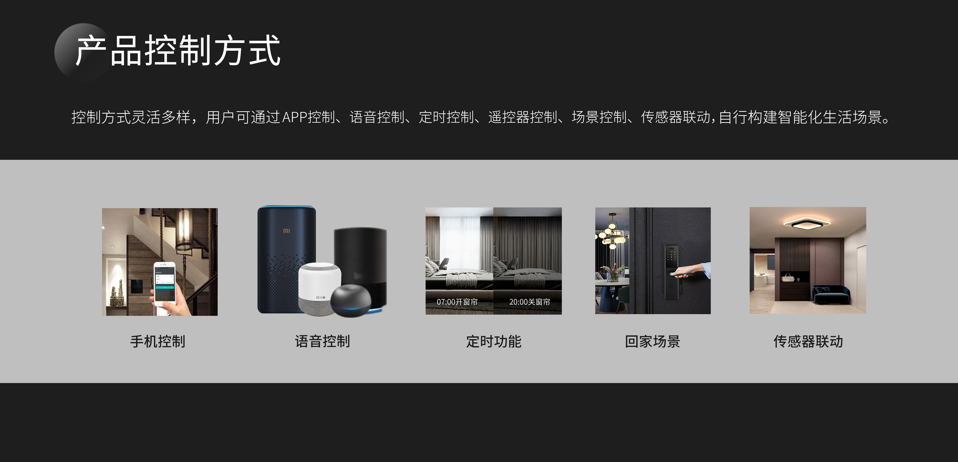我們整套系統(tǒng)有多種控制方式:APP控制、語音控制、定時(shí)控制、遙控器控制、場(chǎng)景控制、傳感器聯(lián)動(dòng)。
