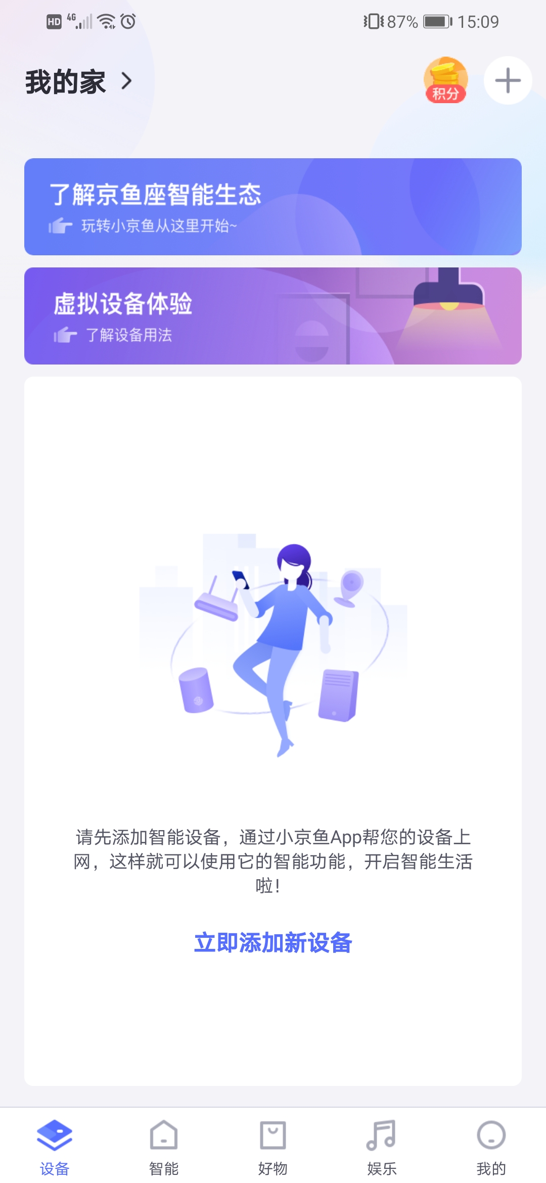 1、 打開“小京魚”APP,點擊下方“設(shè)備”欄,點擊“立即添加新設(shè)備”;