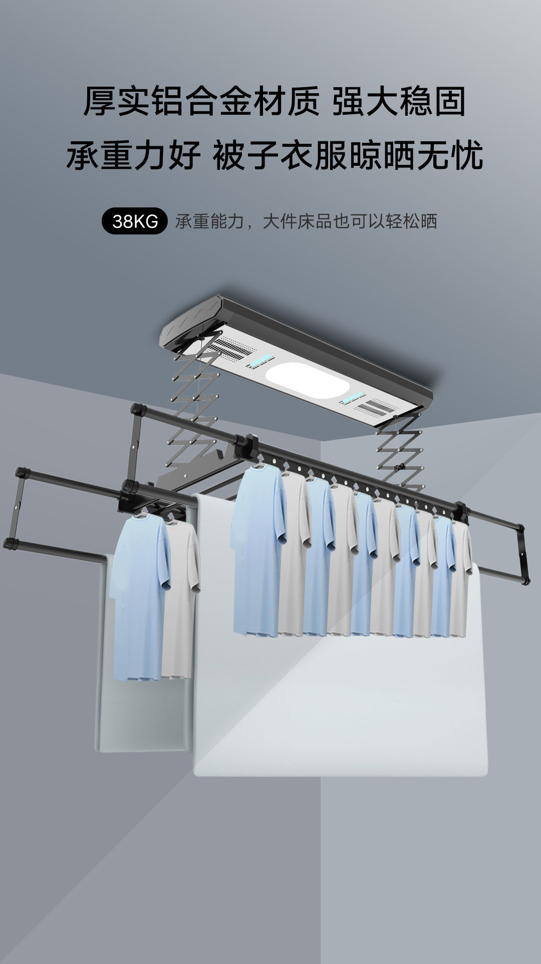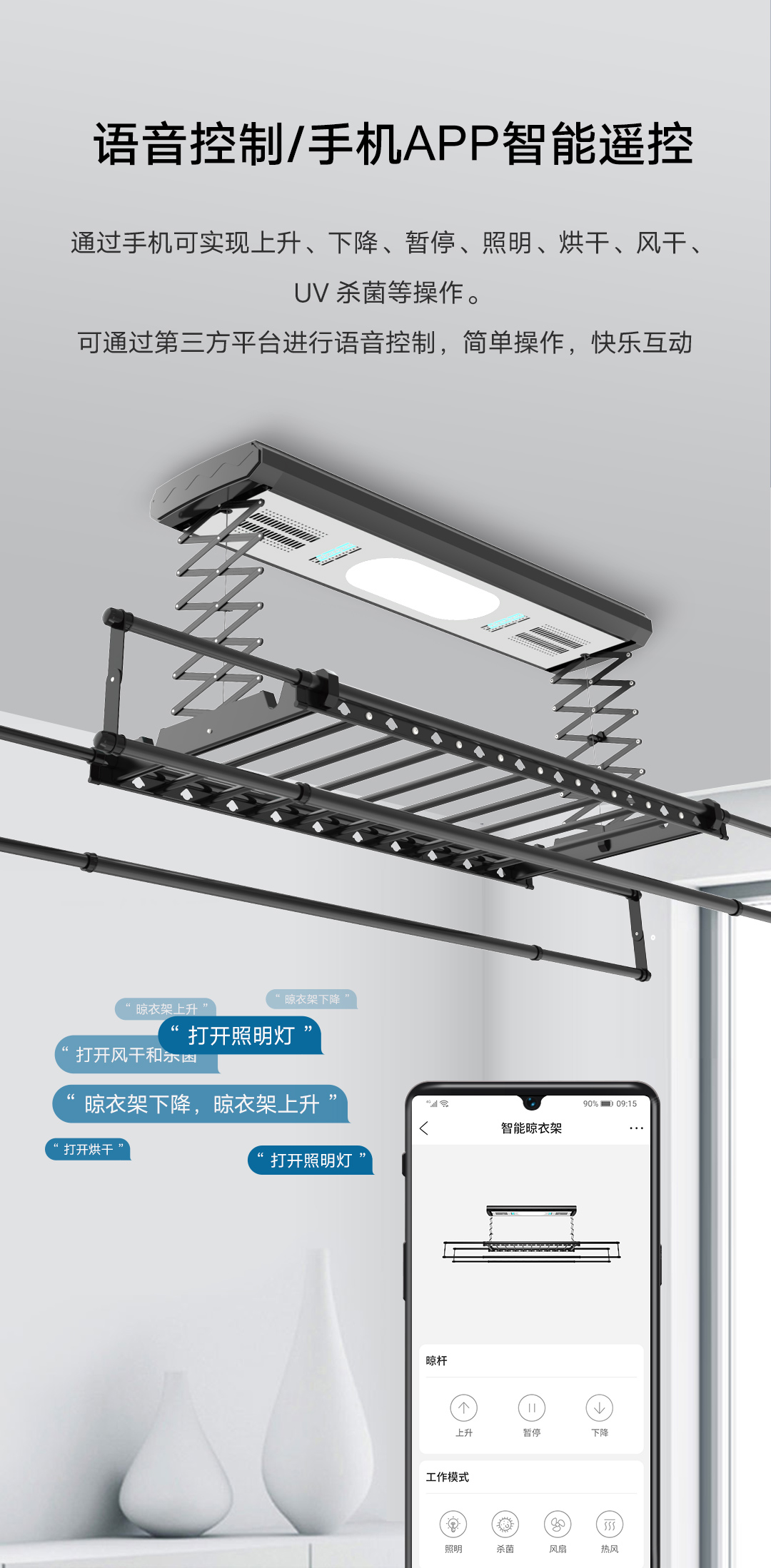 用戶可通過(guò)遙控、手機(jī)實(shí)現(xiàn)上升、下降、暫停、照明、烘干、風(fēng)干、UV殺菌等操作,還可通過(guò)第三方平臺(tái)進(jìn)行語(yǔ)音控制。