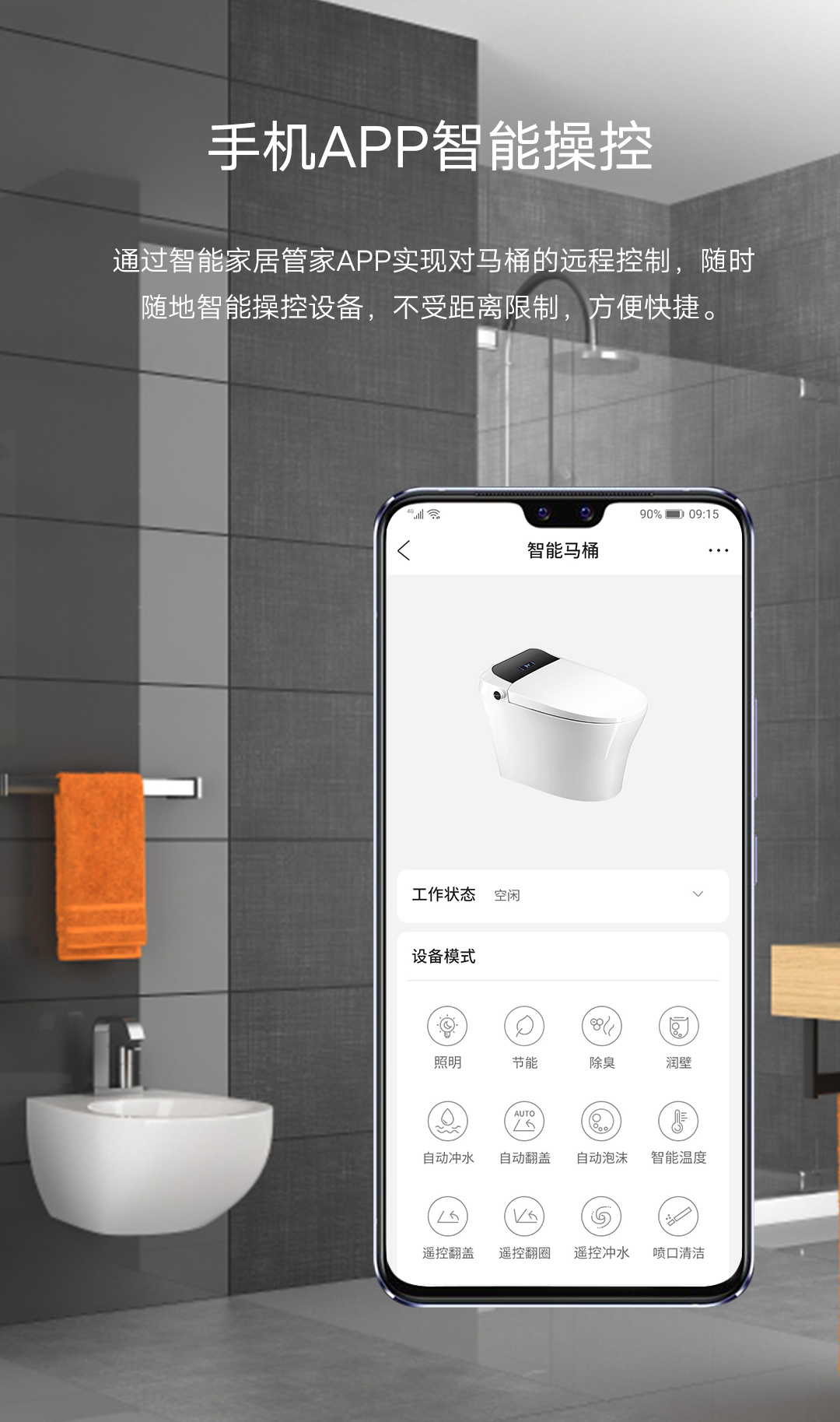 可通過智能家居管家APP實現(xiàn)對馬桶的遠(yuǎn)程控制,隨時隨地智能操控設(shè)備,不受距離限制,方便快捷。
