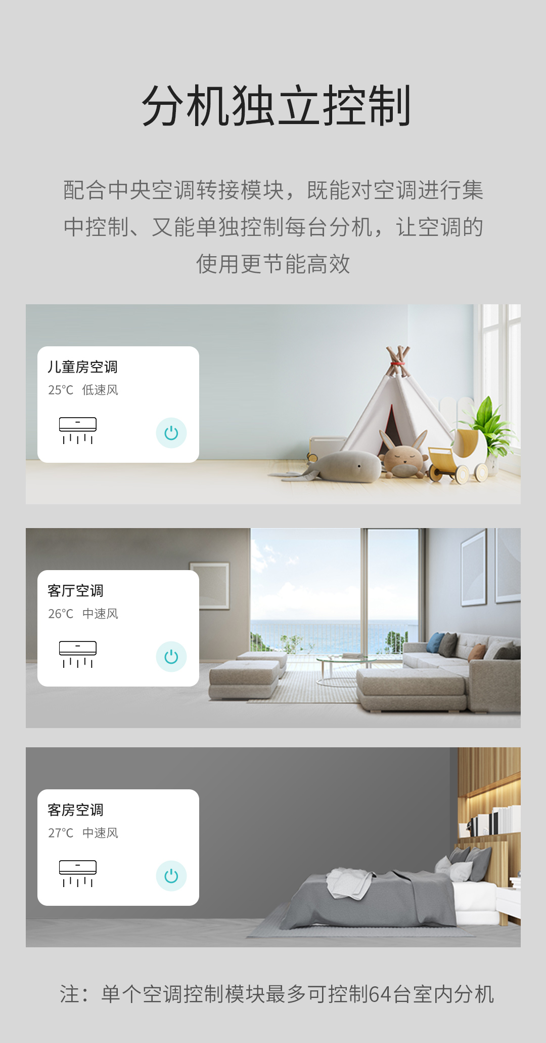 而且中央空調(diào)智能網(wǎng)關(guān)還支持分機獨立控制,單個空調(diào)控制模塊最多可控制64臺室內(nèi)分機,每個分機均可在APP上修改名字并獨立控制,讓空調(diào)的使用更節(jié)能高效。