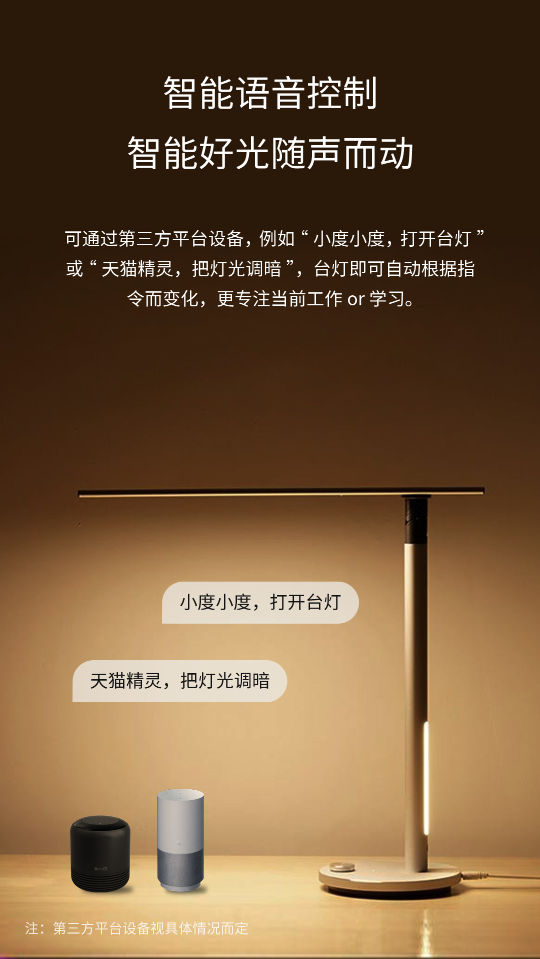 APP還可以連接第三方語音助手服務,比如說小藝、小愛同學、天貓精靈、小度等等,通過智能音箱對臺燈進行語音智控,動動嘴就能開關并調節(jié)燈光亮度、照明模式和切換場景。