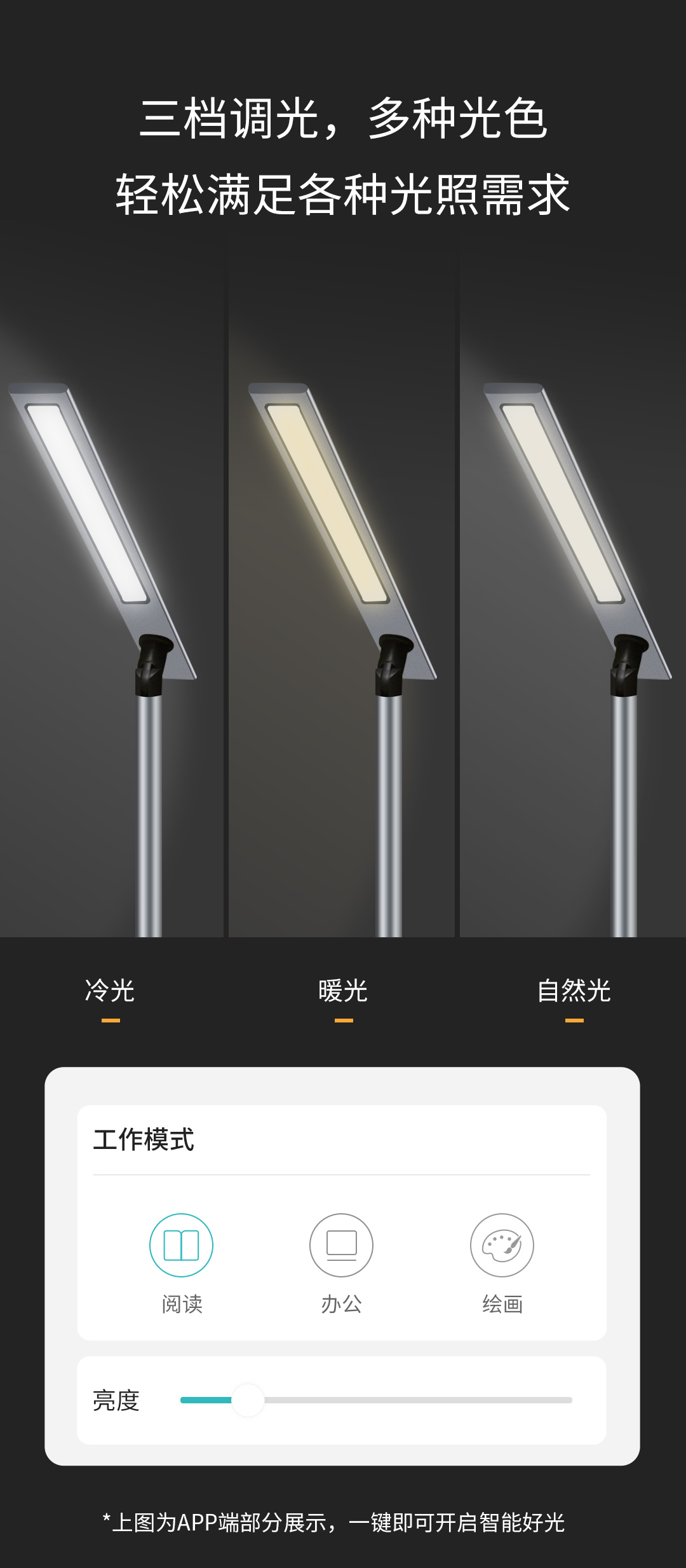 設有三種照明模式(冷光、暖光、自然光),分別是閱讀模式、辦公模式、繪畫模式。三檔調光,多種光色個性調節(jié),一鍵任意切換,輕松滿足各種光照需求。