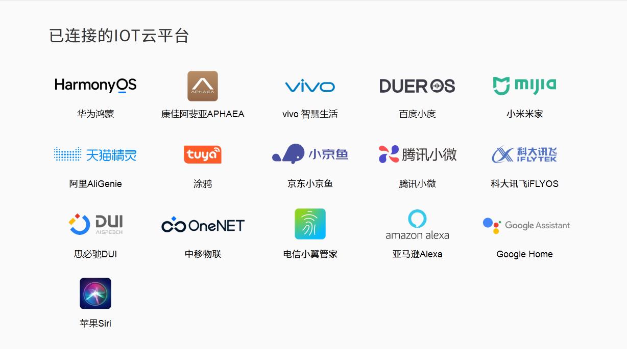 截至目前,智匯云自研的IOT云平臺(tái)與主流生態(tài)平臺(tái)均完成對(duì)接,與華為智慧生活、康佳阿斐亞APHAEA、vivo 智慧生活、百度小度、小米米家、阿里AliGenie、京東小京魚(yú)、騰訊小微、科大訊飛iFLYOS、思必馳DUI、中移物聯(lián)、電信小翼管家、亞馬遜Alexa、Google Home、蘋(píng)果Siri等國(guó)內(nèi)外IOT云平臺(tái)互聯(lián)互通。