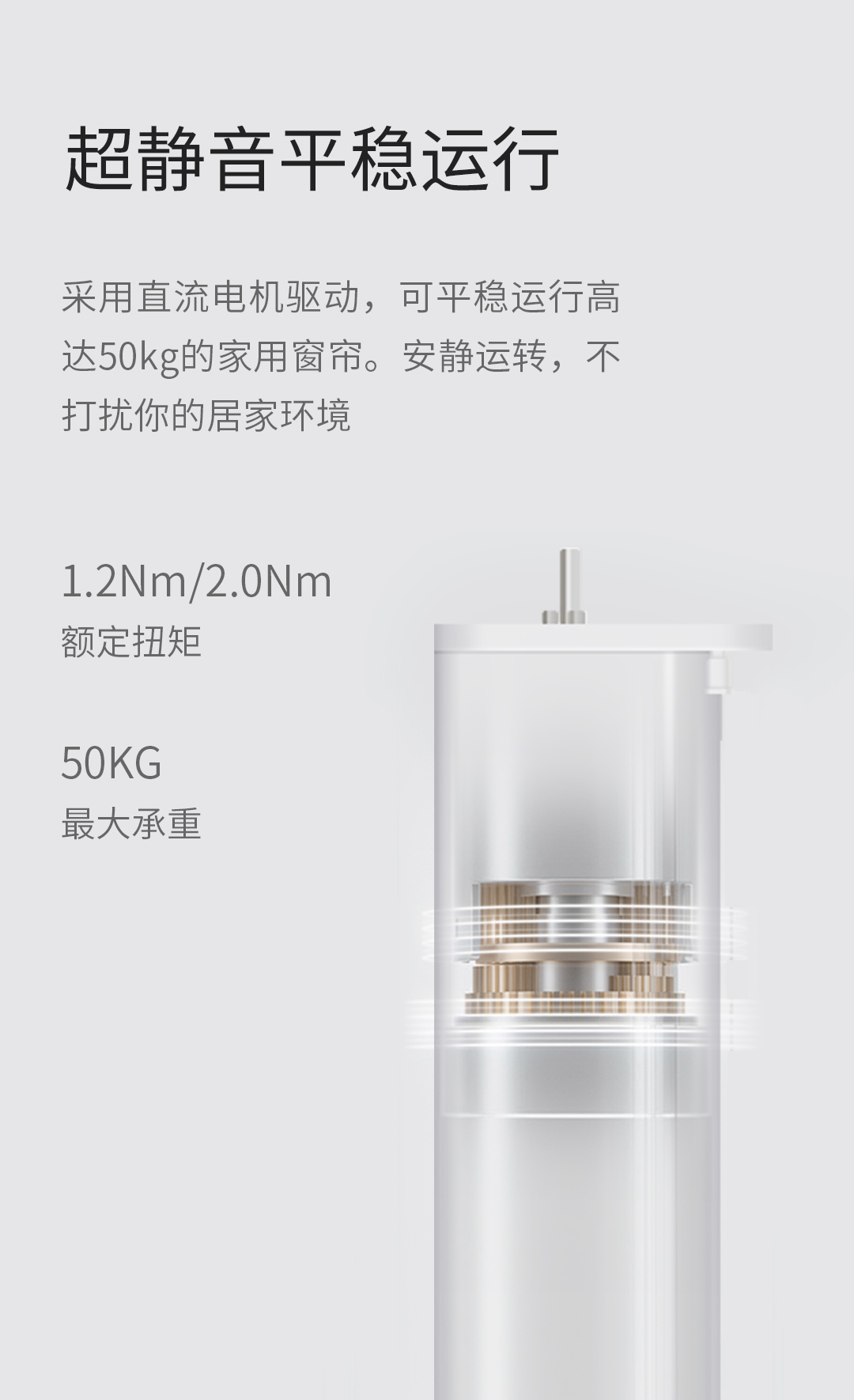 采用直流電機驅(qū)動和高扭矩馬達,可承重50kg的窗簾平穩(wěn)運行,品質(zhì)穩(wěn)定,運行順滑無噪音。