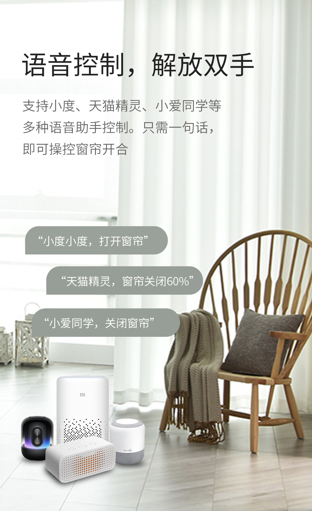 支持語音交互控制,接入國內(nèi)外主流第三方語音助手系統(tǒng),與小藝、小度、小愛、天貓精靈等智能音箱搭配使用,一句話即控制窗簾開合,躺在消發(fā)上暢享愜意時光。