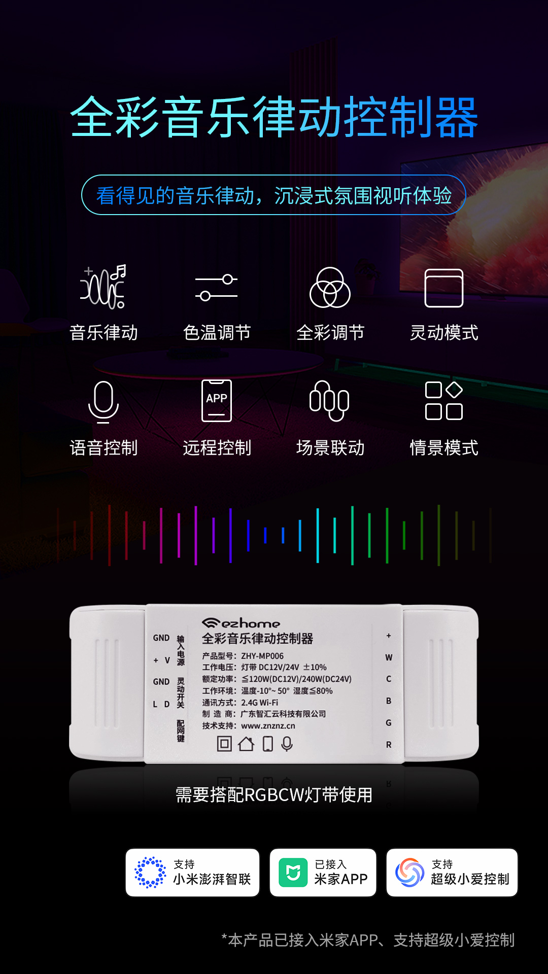 智匯云新品全彩音樂律動(dòng)控制器已接入米家APP,可以和其他接入米家的產(chǎn)品互聯(lián)互動(dòng),打造更加豐富的應(yīng)用場(chǎng)景,滿足用戶多種照明需求,打造更加全面的光環(huán)境。