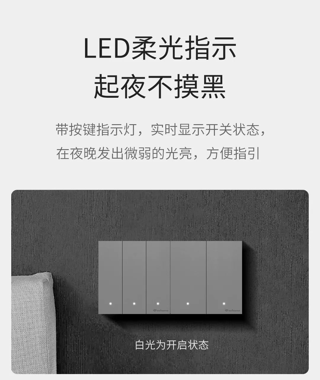 關(guān)燈后,在黑暗中幽然散發(fā)暖黃柔光指示,夜晚開關(guān)位置一目了然。通過手機(jī)APP可單獨(dú)關(guān)閉面板狀態(tài)指示燈,保證燈光不會(huì)影響睡眠質(zhì)量。